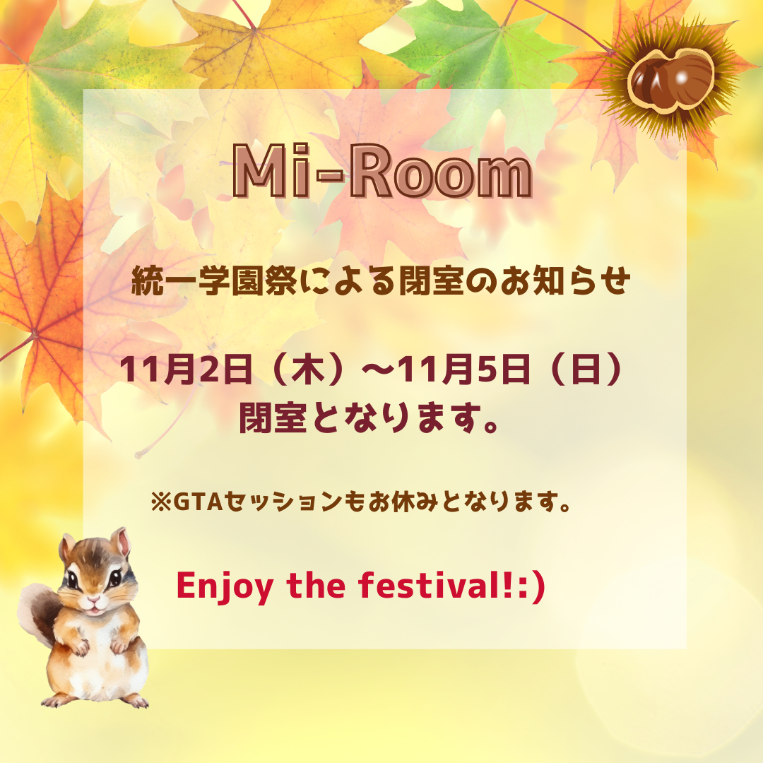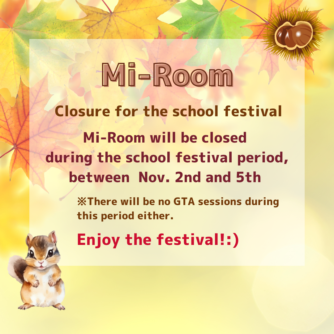 Mi-Room will be closed during the school festival period, between Nov. 2nd and 5th.