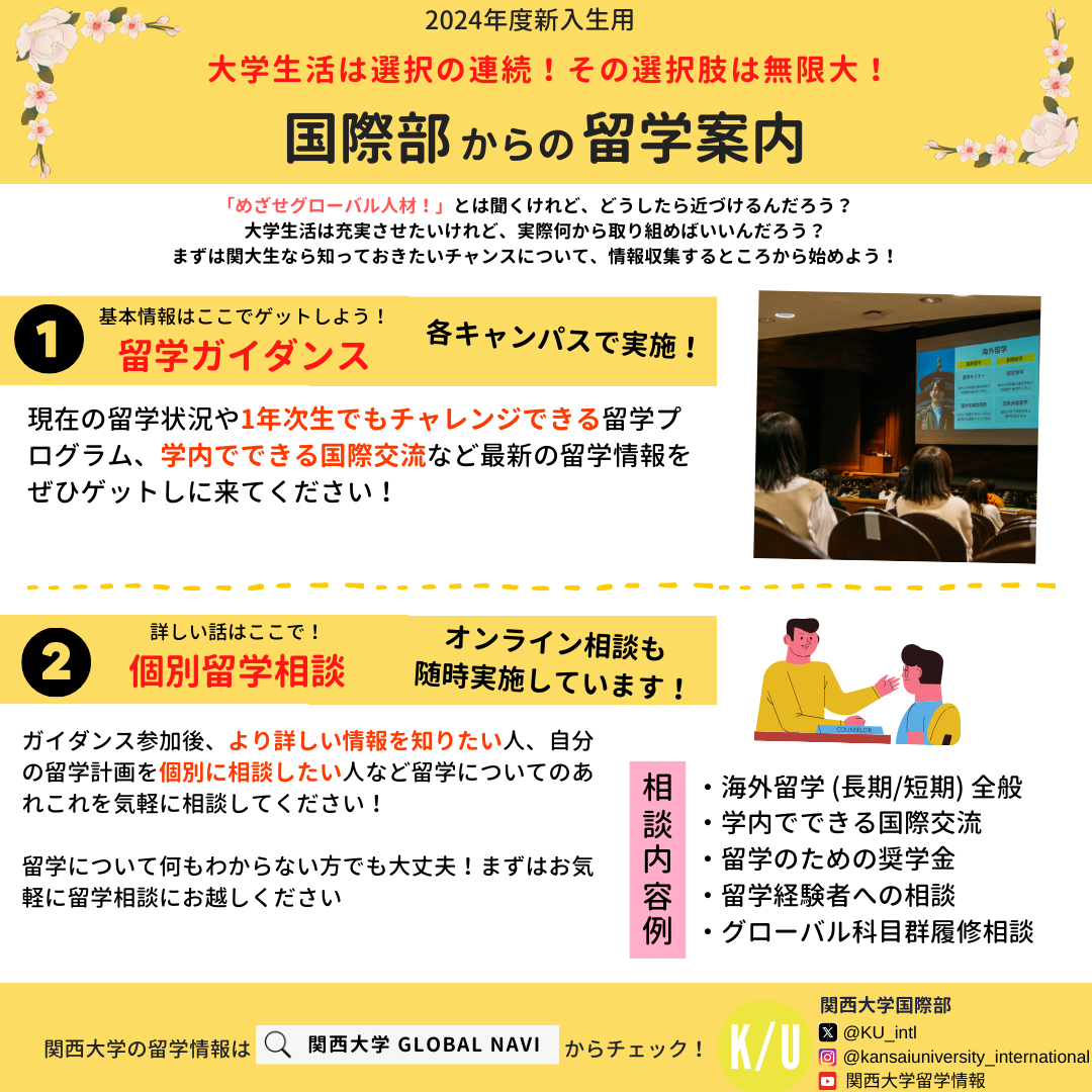 関西大学では期間・形態・内容において多種多様な留学プログラムがあります。最も早くて1年生の夏休みから参加できる留学プログラムもあります。留学したいと思っている人もそうでない人も、新しい選択肢を見つけに4月4日開催の留学ガイダンスにぜひご参加ください。