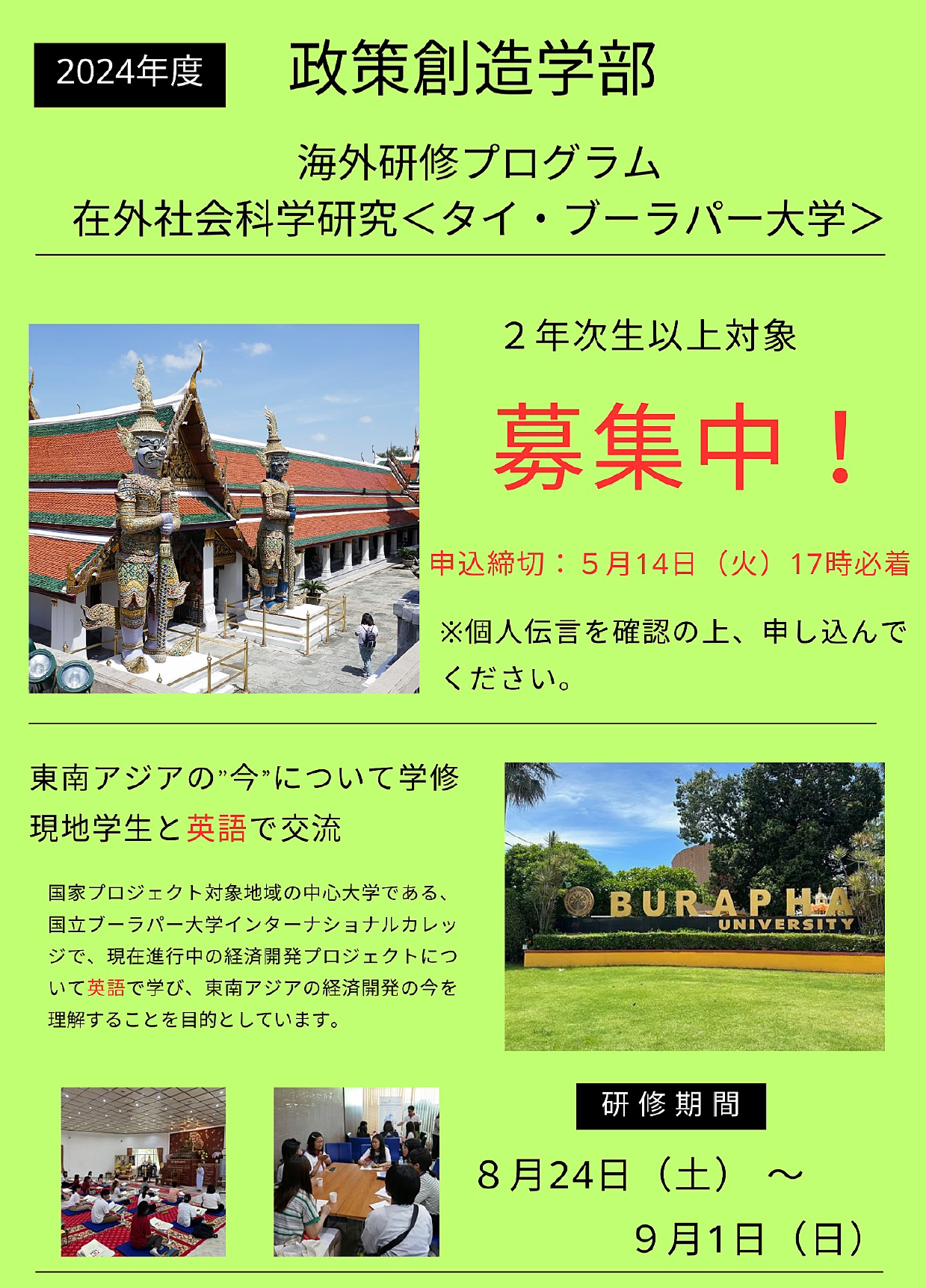 [政策創造学部生限定]2024年度在外社会科学研究<タイ・ブーラパー大学>参加申込み開始のご案内