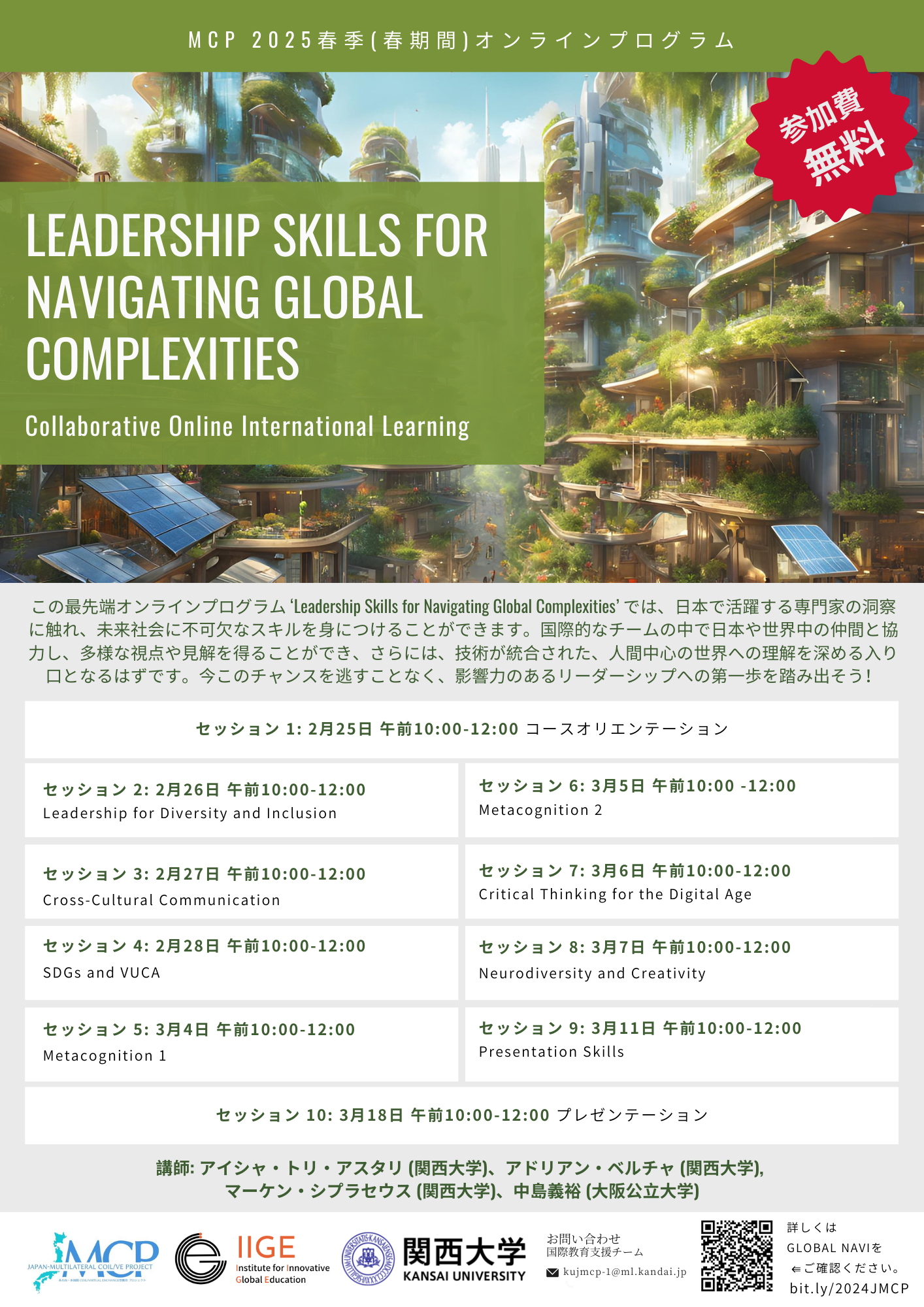Leadership Skills for Navigating Global Complexitiesでは、急速に進化する現代社会において、Society5.0の概念や異文化間コミュニケーションスキルを学ぶことで、グローバルな課題に対応できるリーダーシップを身につけます。海外パートナー大学からも参加を募り、多様な環境で柔軟な対応力を養います。講義やディスカッションを通じて、国際的な視点からリーダーシップの本質を深く理解し、グローバルな問題に対処するための実践的な知識とスキルを獲得します。