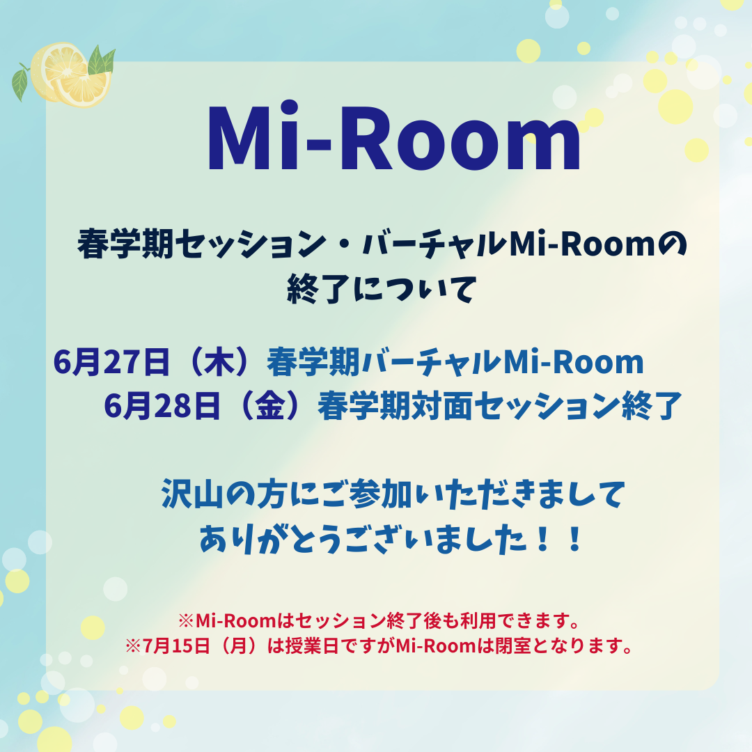 6月27日にVirtual Mi-Room、6月28日に春学期のMi-Roomセッションを全て終了とさせていただきます。