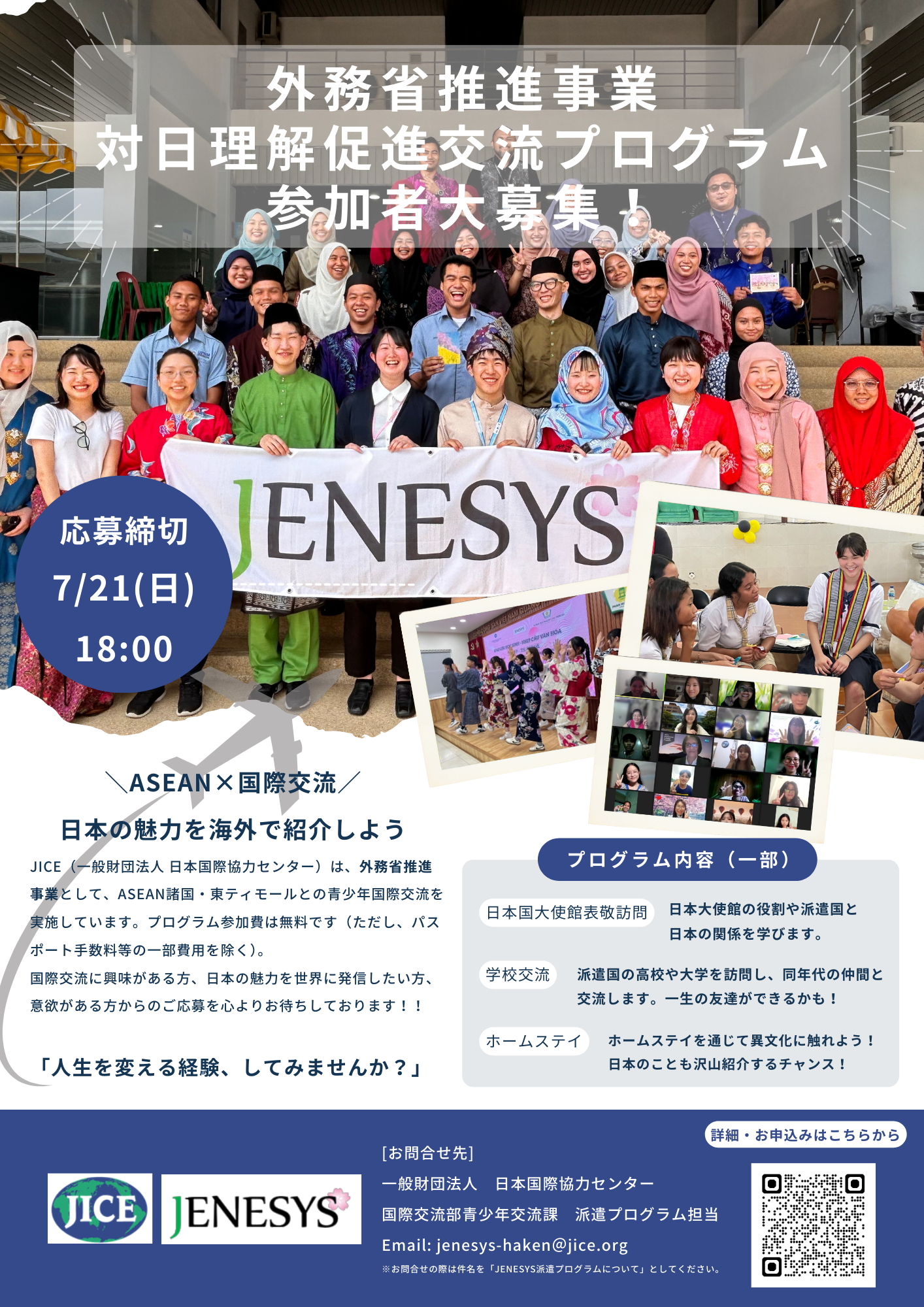 一般財団法人日本国際協力センター(JICE)では対日理解促進交流プログラム「JENESYS」(対象国:ASEAN 諸国及び東ティモール)の実施団体として青少年交流事業を実施しています。