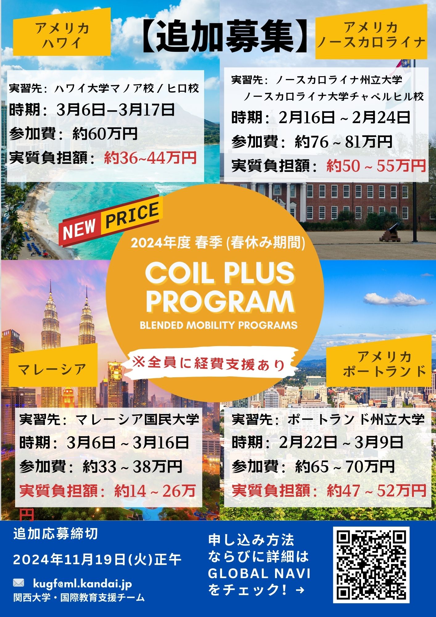 下記の通りプログラム費と一部渡航日程が変更になりましたのでご確認ください。