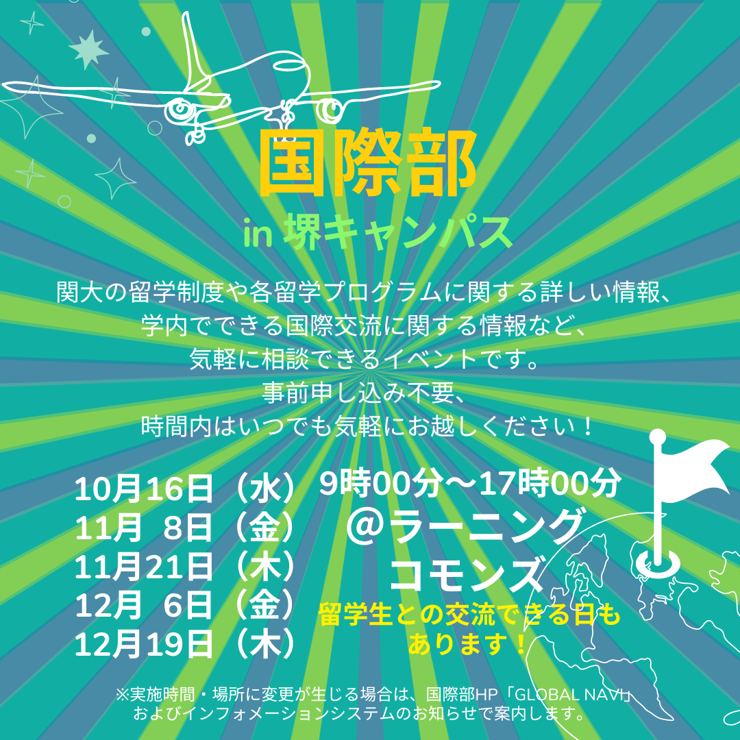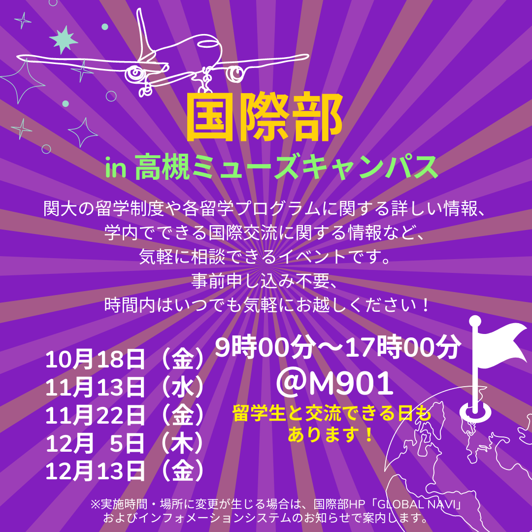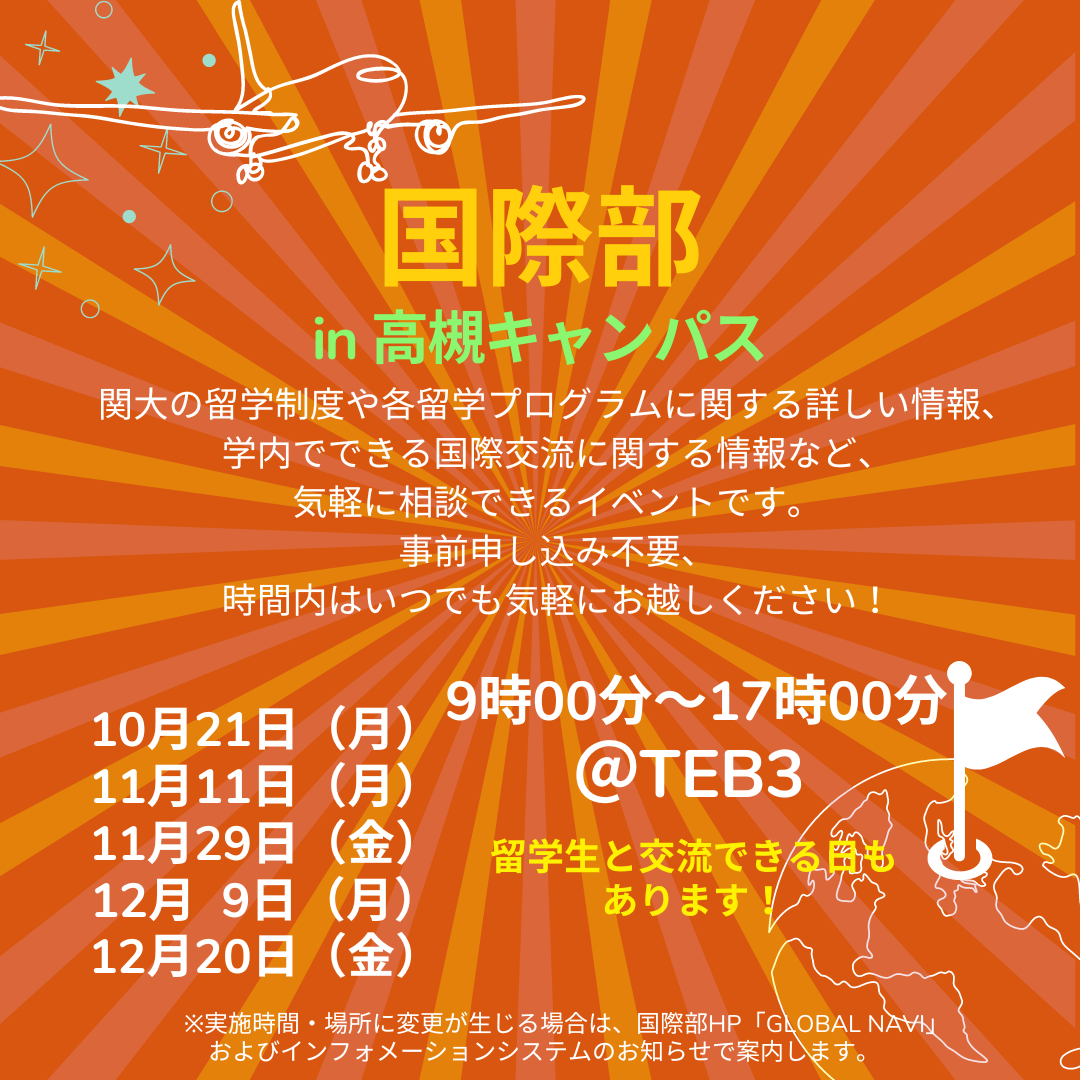 関大の留学制度や各留学プログラムに関する相談や、学内でできる国際交流に関する情報収集に加え、以下の日程では各キャンパスで関大に来ている留学生と交流ができます。