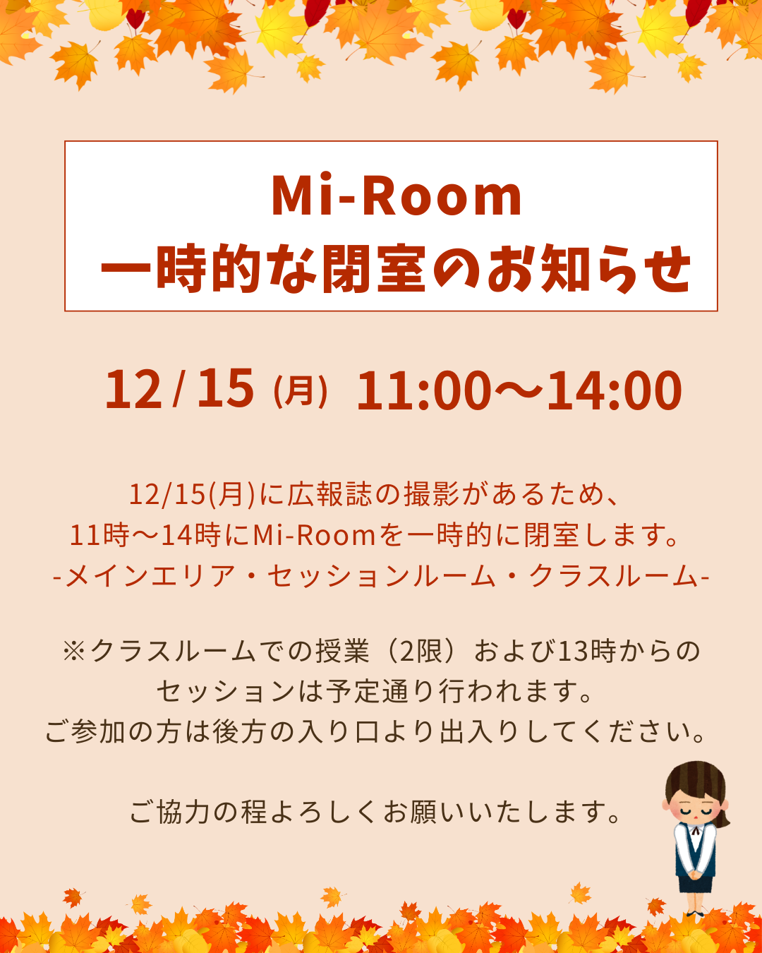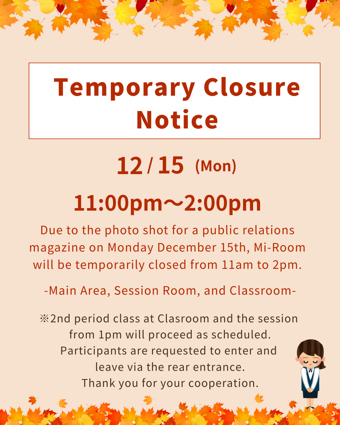 【Mi-Room】一時的な閉室のお知らせ/ Temporary closure