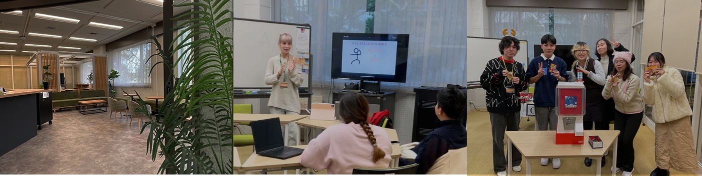 キャンパス内に設置されている部屋(対面バージョン)と、仮想空間としてアクセスできる部屋(オンラインバージョン)の2種類あり、語学力の向上はもちろん、国際感覚を培うことができます。
