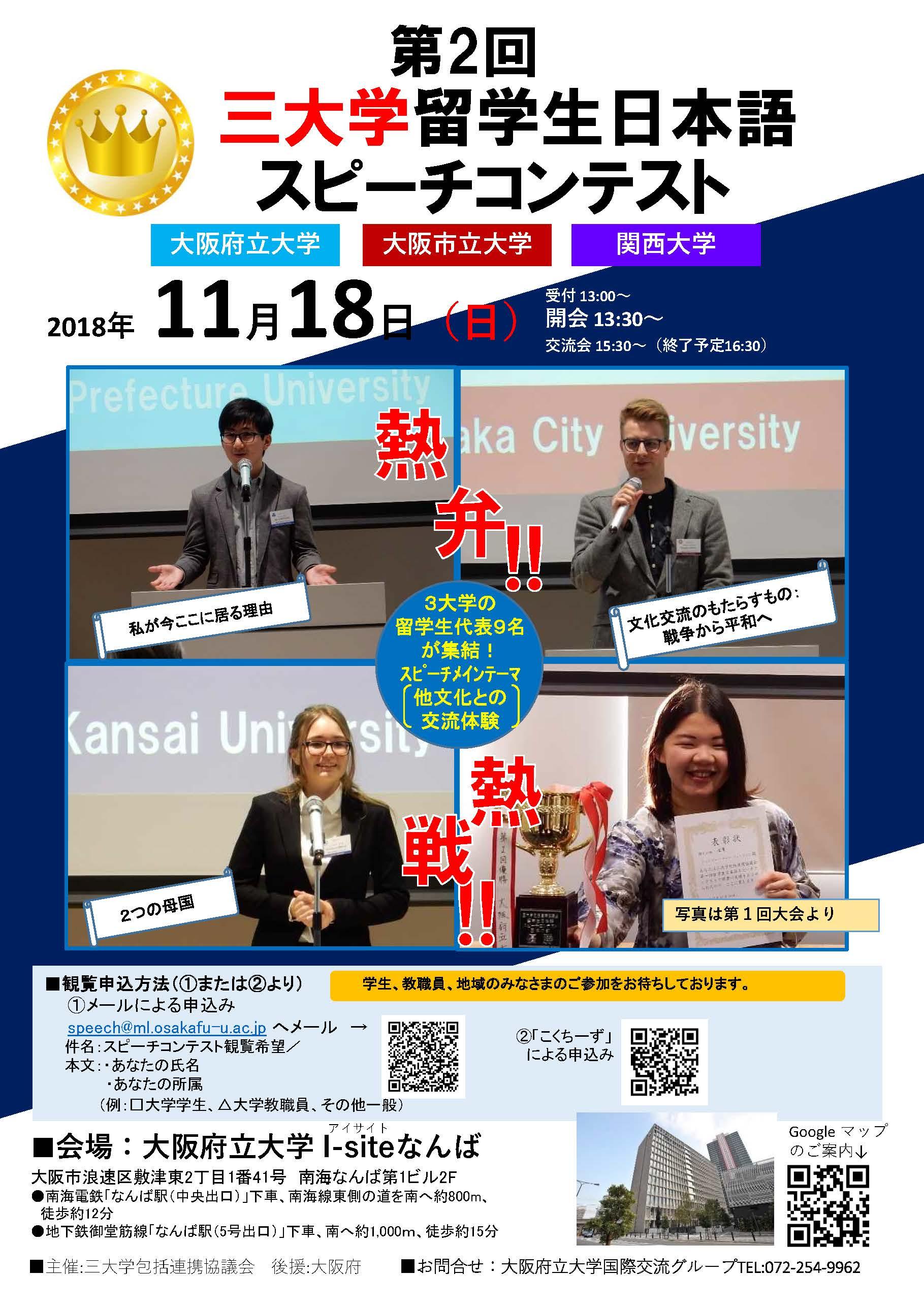 11/18(日)午後から、第2回三大学留学生スピーチコンテストが、 大阪府立大学なんばサテライト(i-siteなんば)で開催されます。