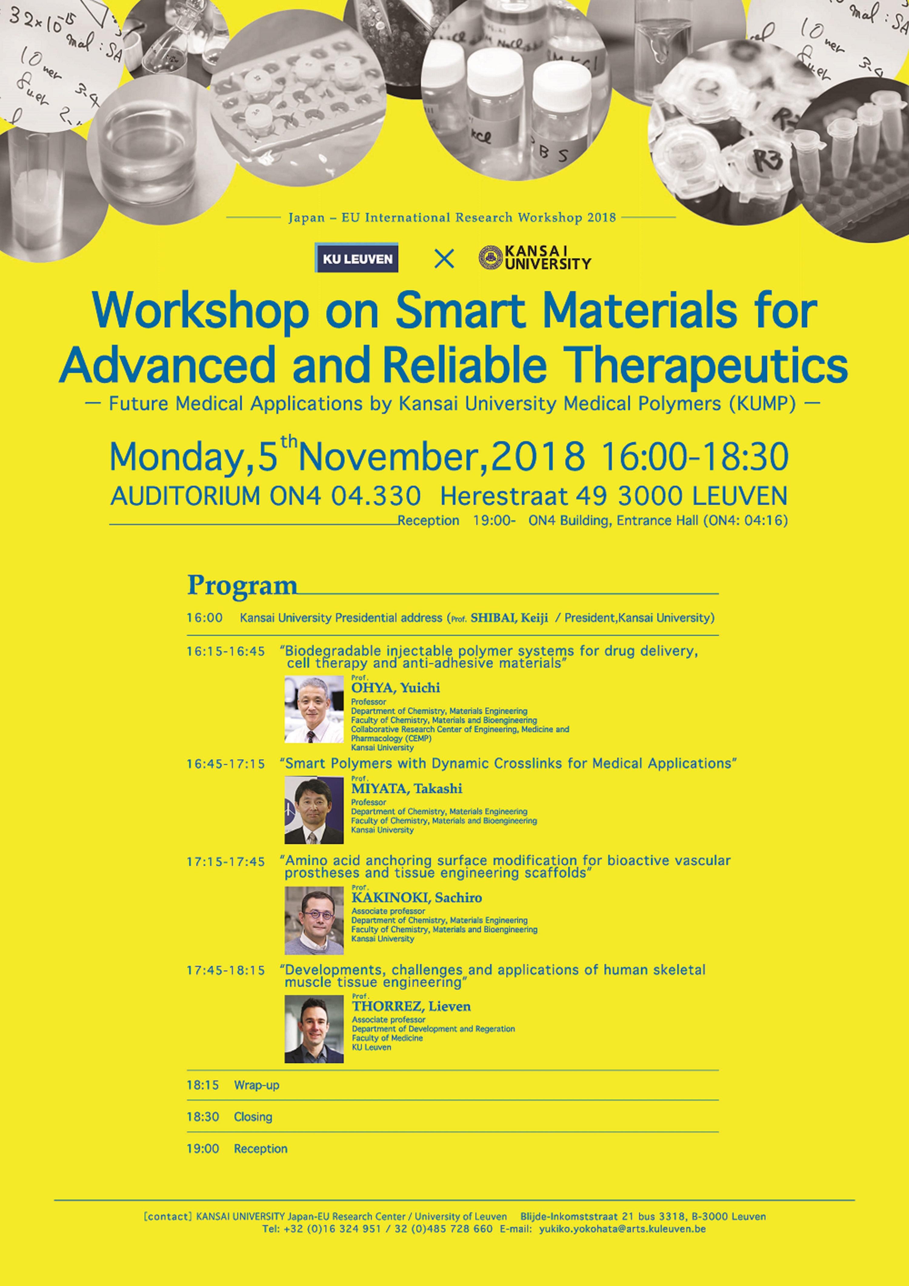 関西大学日本EU研究センターが設置されているベルギーのルーヴェン大学で5日、“Workshop on Smart Materials for Advanced Reliable Therapeutics -Future Medical Applications by Kansai University Medical Polymers(KUMP)-”をテーマとする「日本・EU国際研究ワークショップ2018」を開催しました。