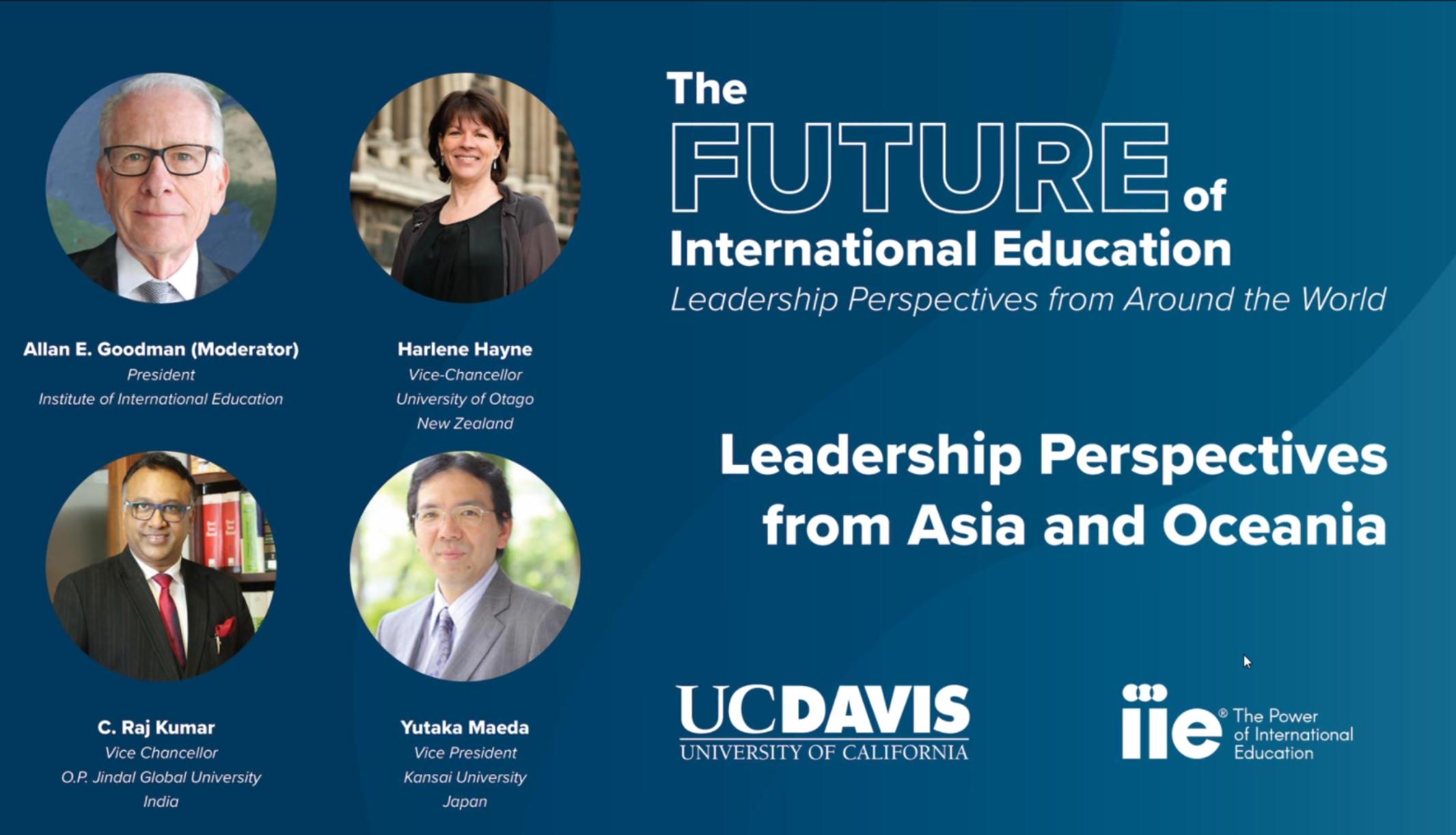 7月3日に、本学副学長・国際部長兼IIGE機構長の前田裕先生が、米国UCDavid校とIIE(Institute of International Education)が主催する「The Future of International Education: Leadership Perspectives from Around the World」のウェビナーに招待され、登壇しました。