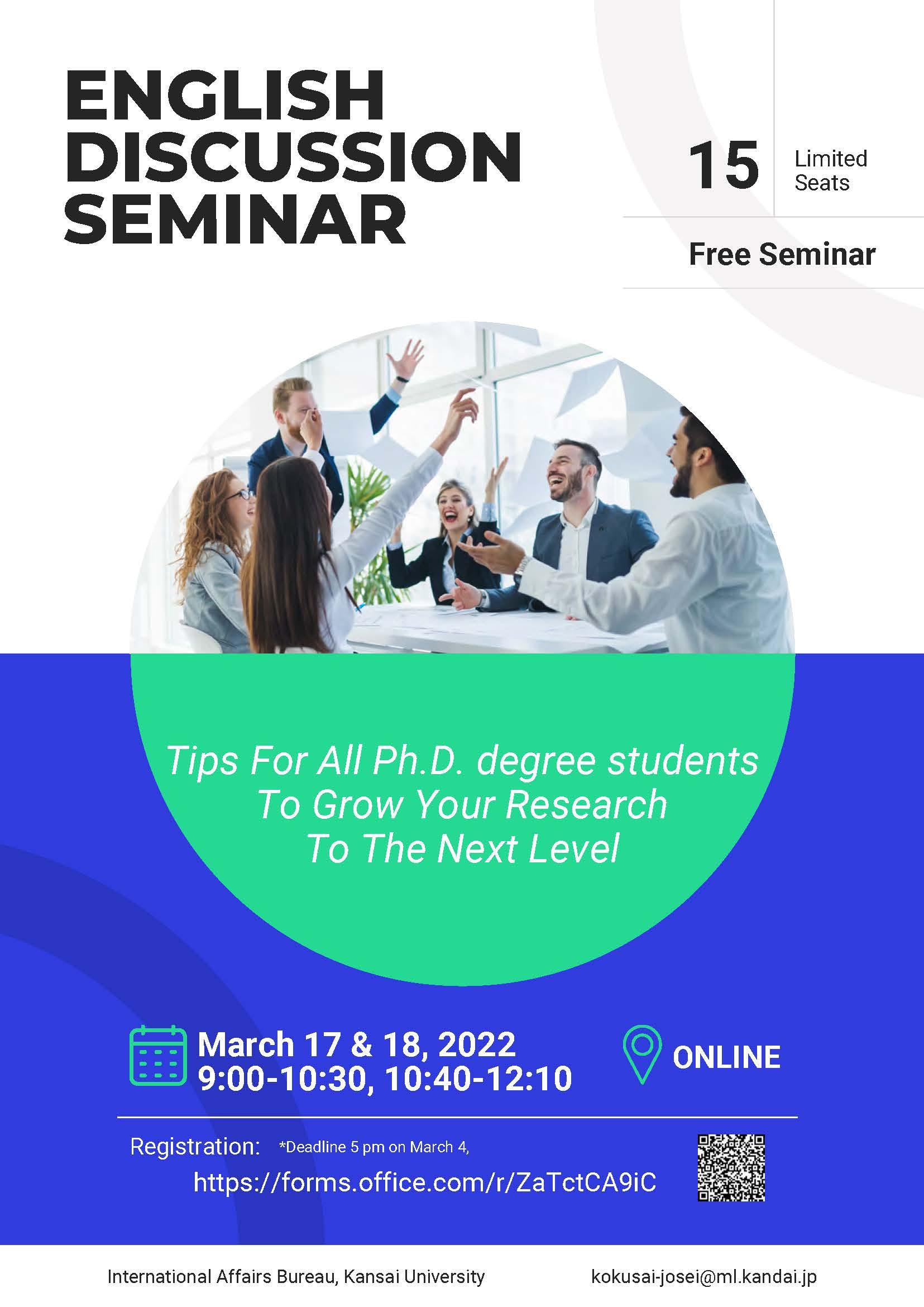 関西大学国際部では、海外の研究者との交流、海外でのフィールドワークを希望する博士課程後期課程の在学生を対象に、以下の要領で、オンライン英語ディスカッション講座を実施します。詳細は添付ファイルをご覧いただき、希望の学生は、締切日までに所定URLよりお申し込みください。