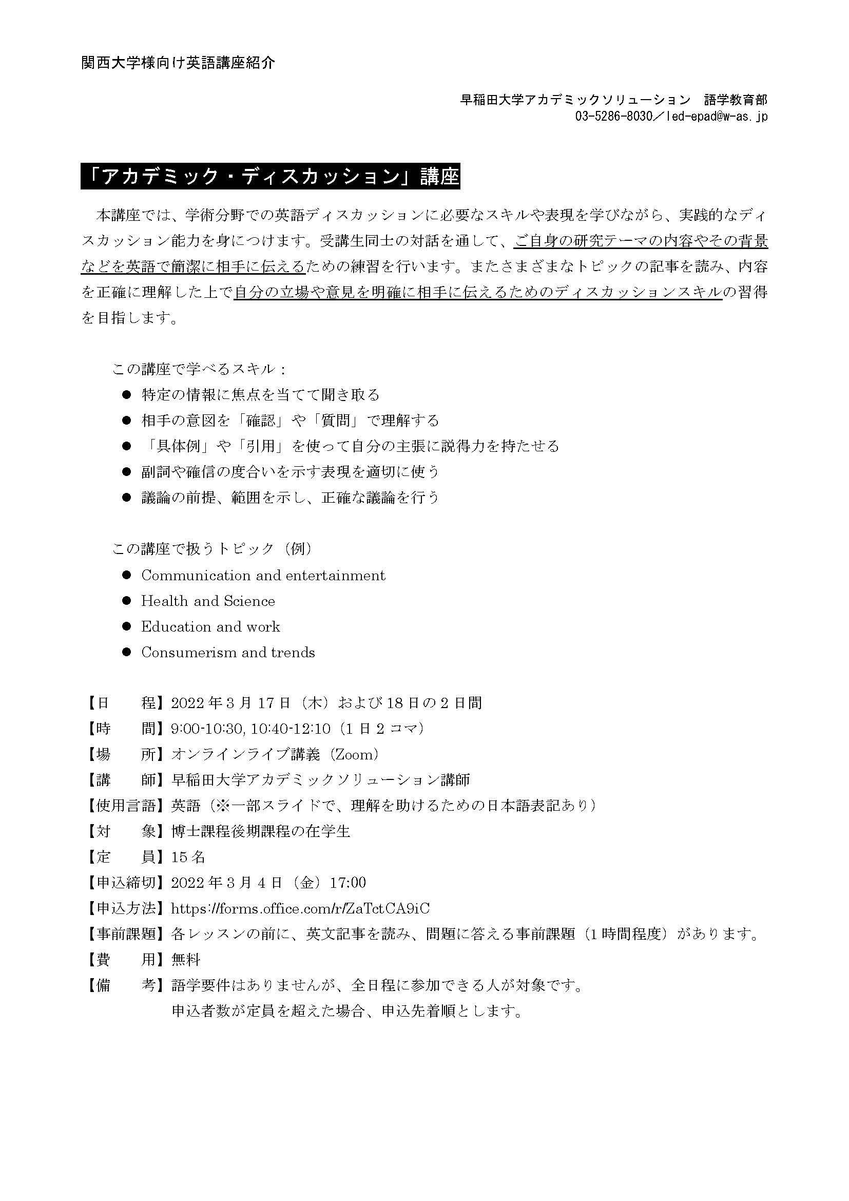 2022/02/25 【博士後期課程在学生向け】オンライン英語ディスカッション講座