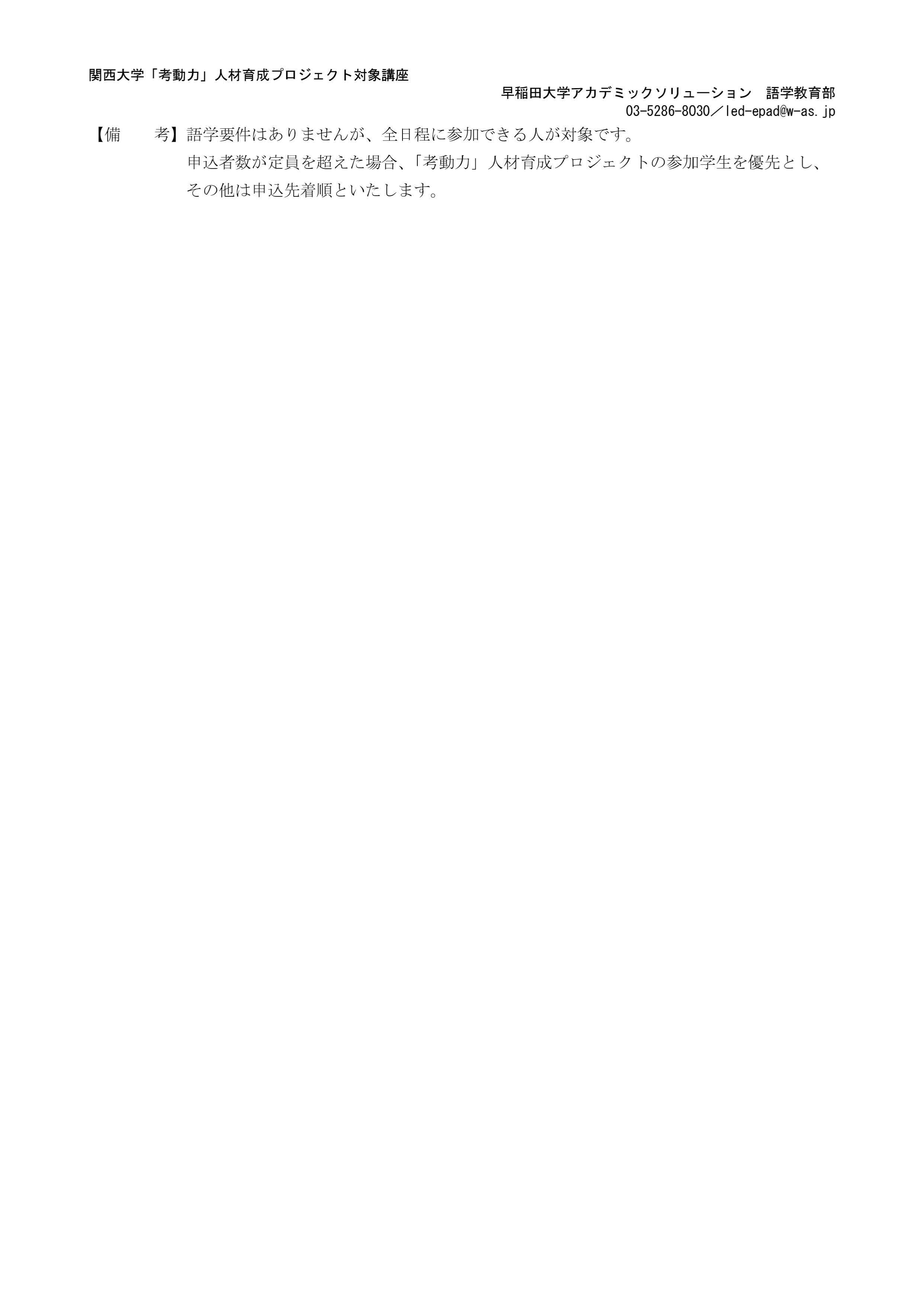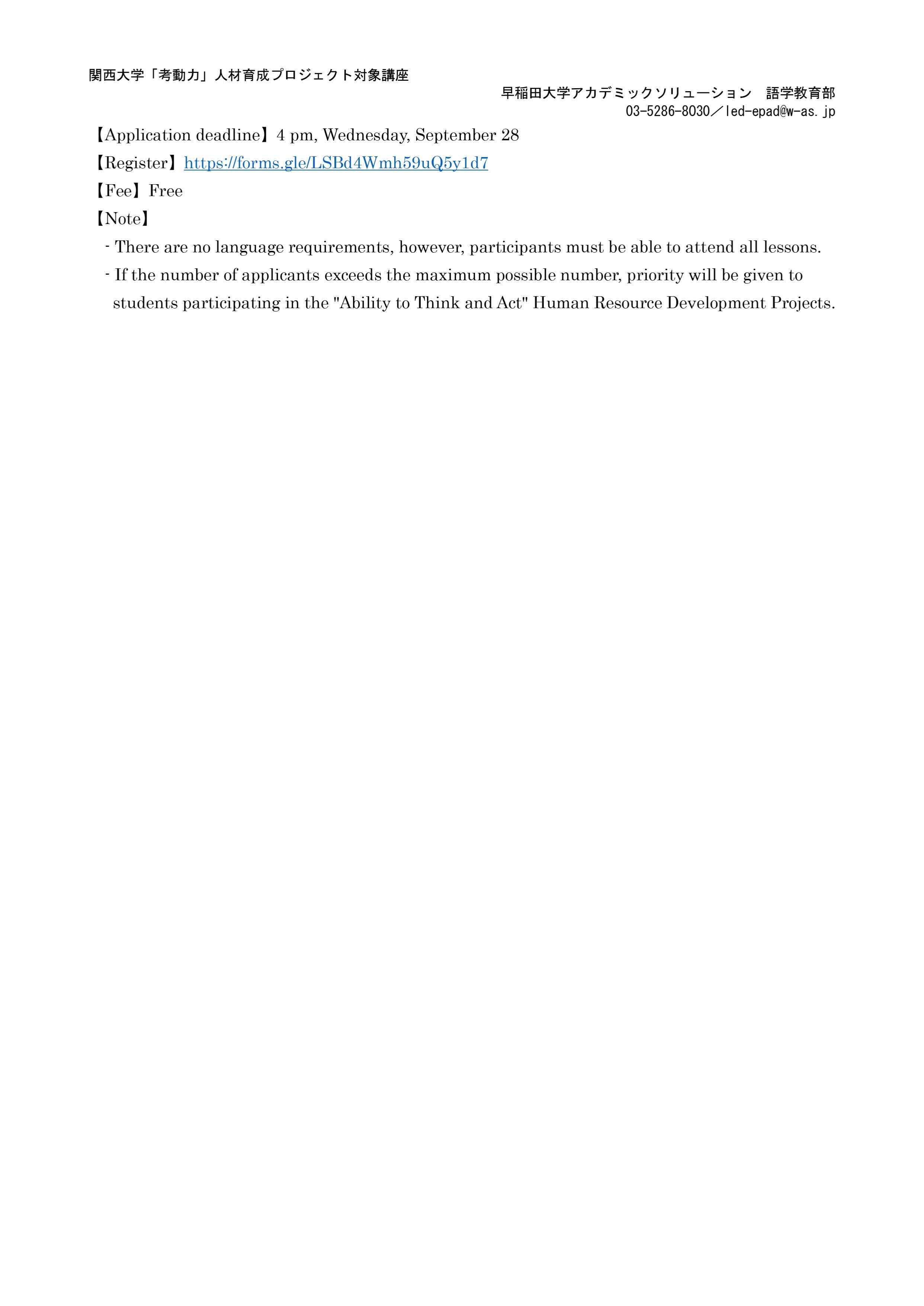 申込者数が定員を超えた場合、「考動力」人材育成プロジェクトの参加学生を優先とし、その他は申込先着順といたします。