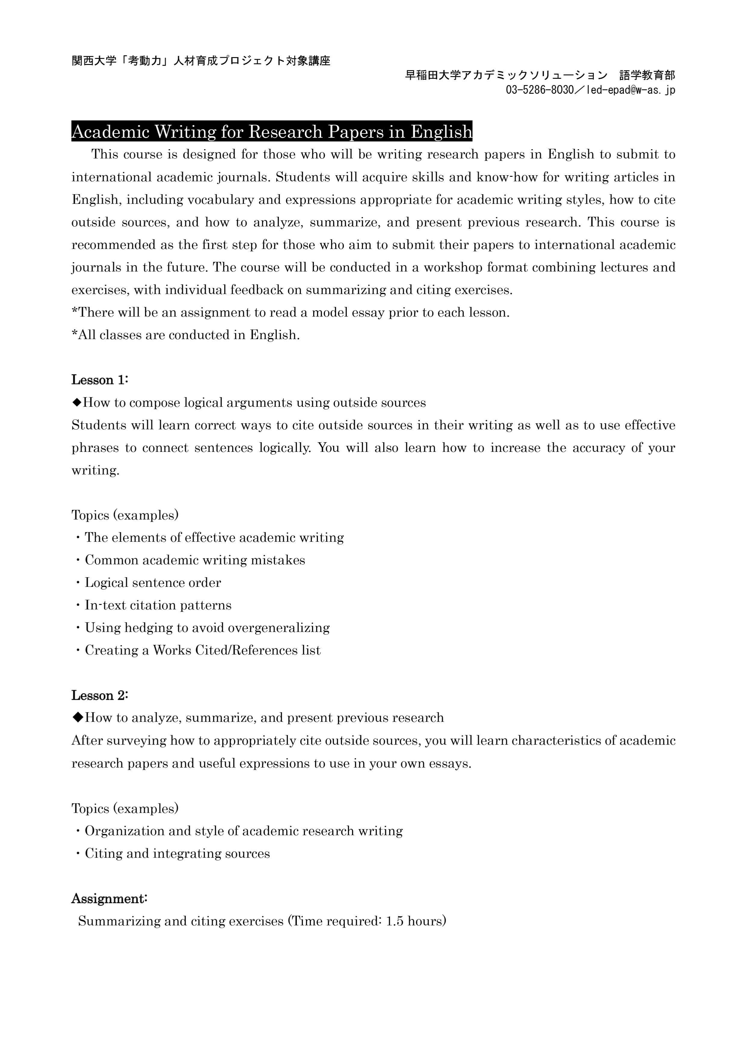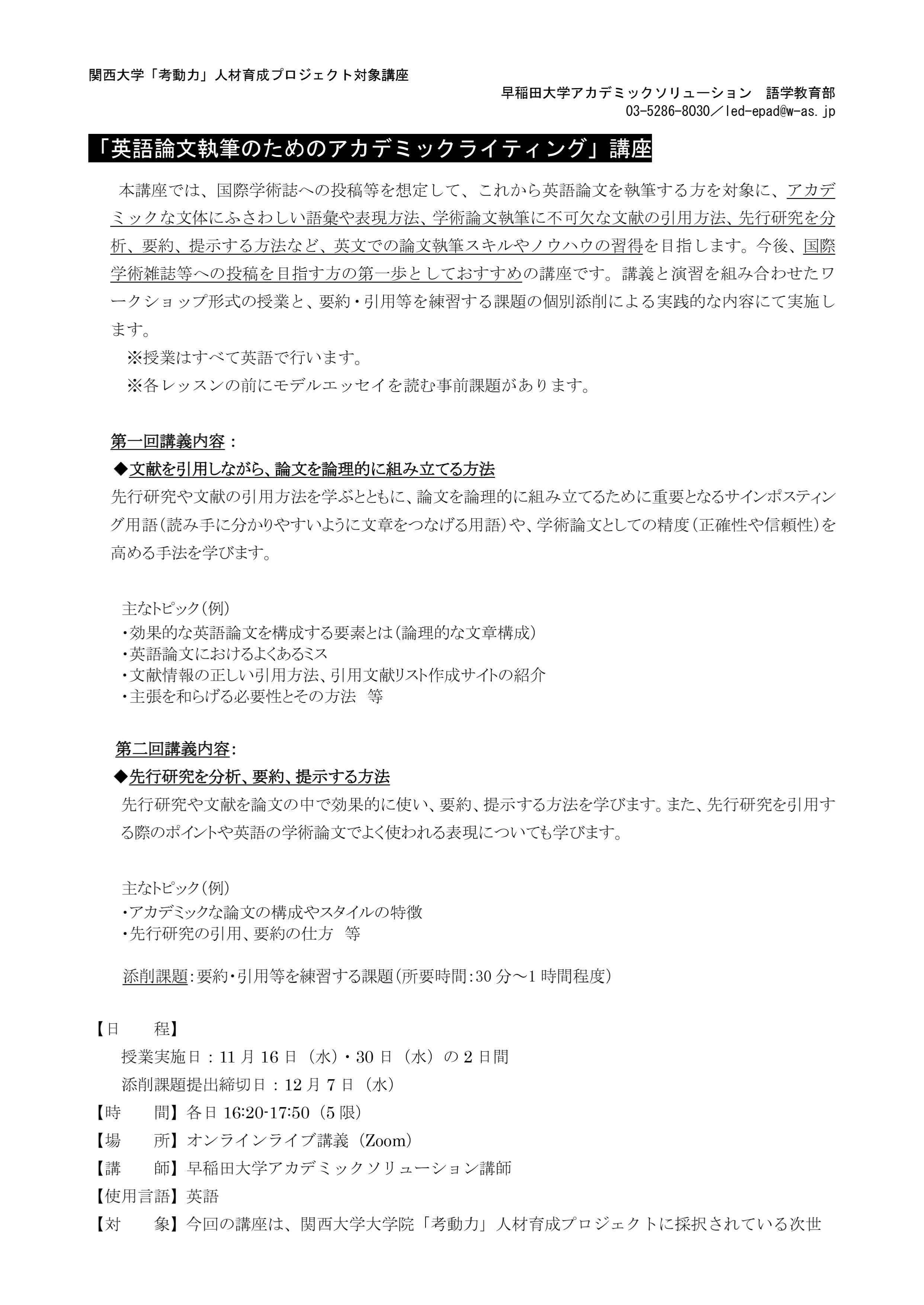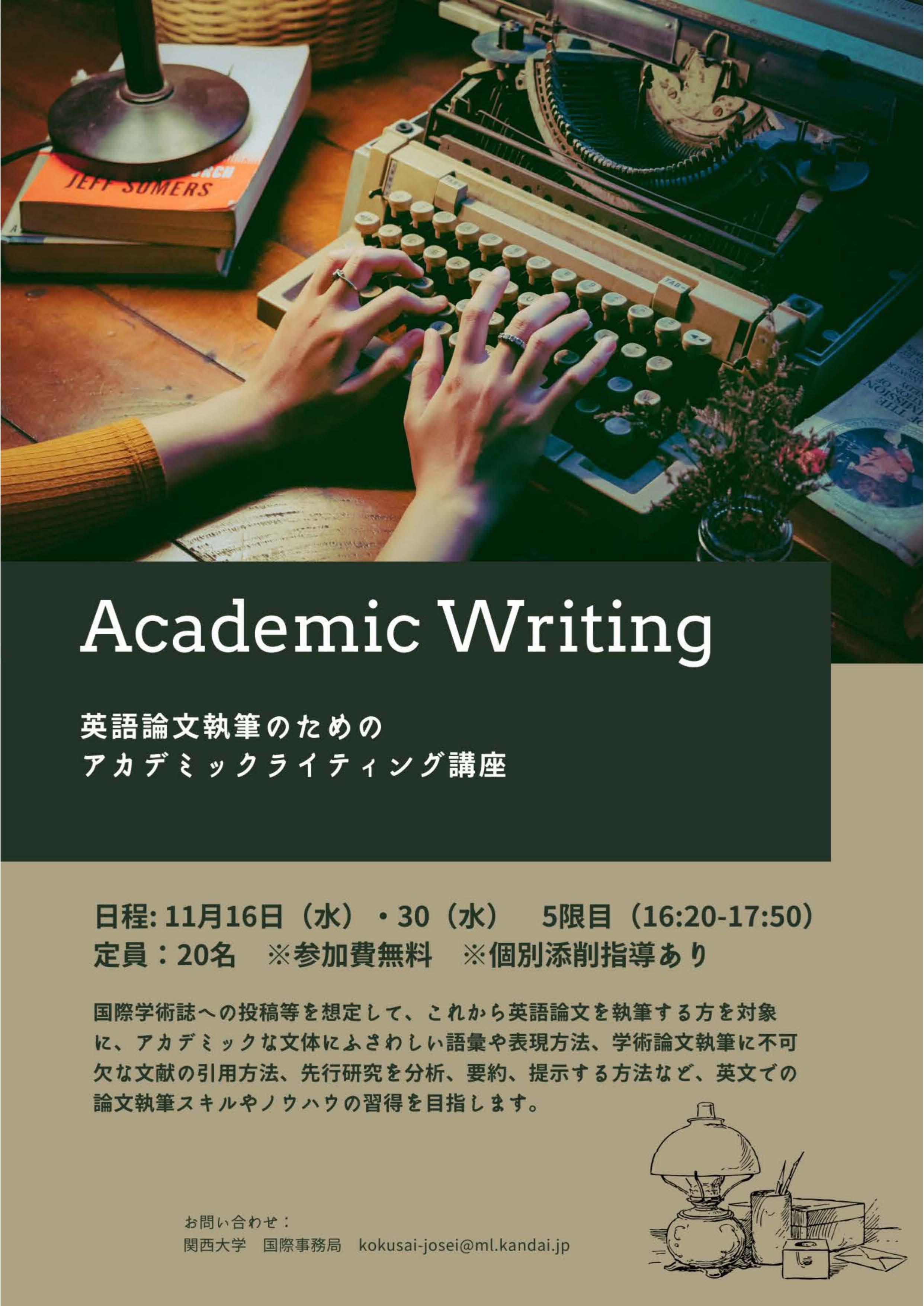 関西大学国際部では、国際学術雑誌等への投稿を想定したアカデミックな文体にふさわしい語彙や表現方法など、
