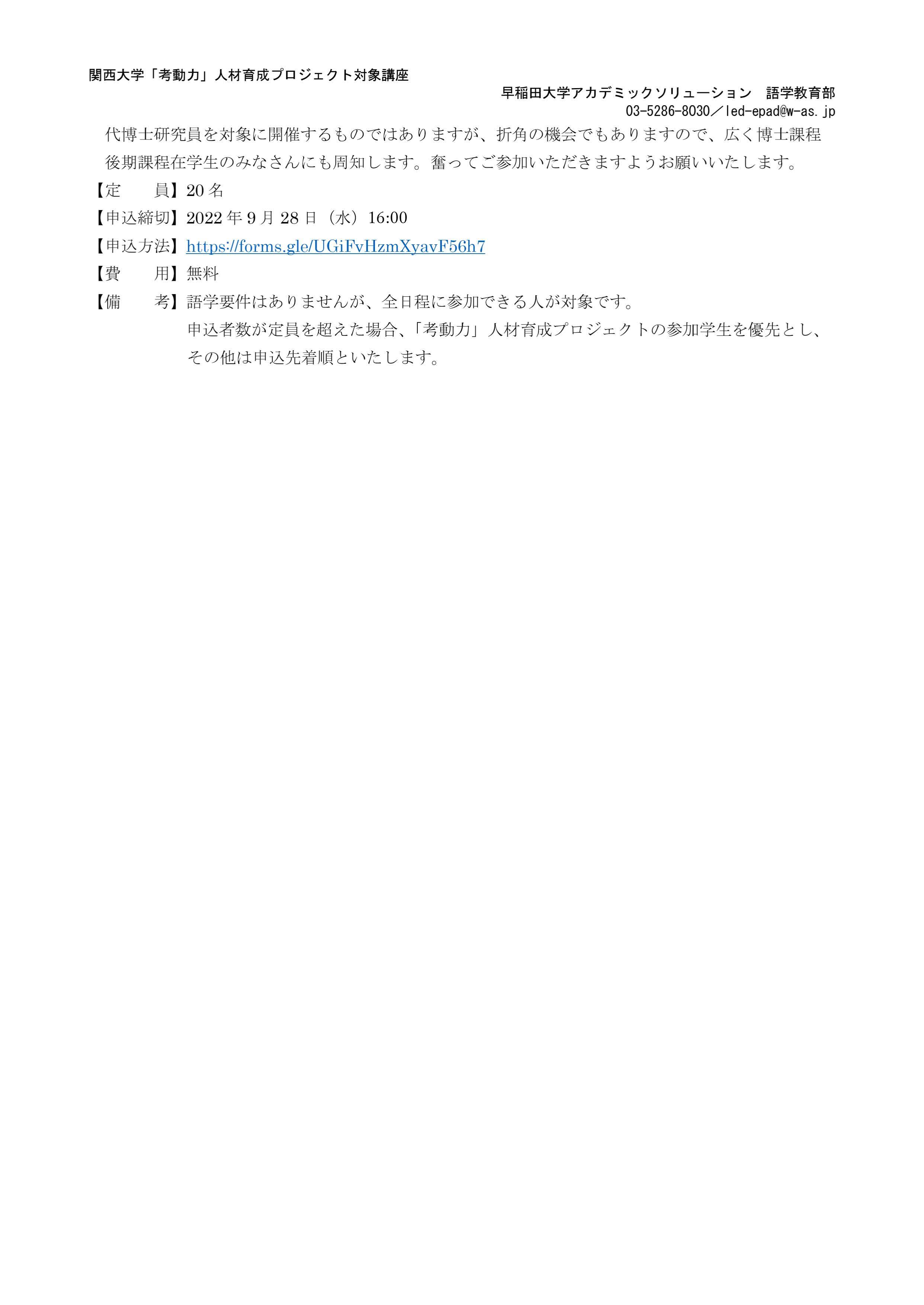 【対 象】関西大学大学院「考動力」人材育成プロジェクトに採択されている次世代博士研究員、博士課程後期課程在学生、前期(修士)課程の学生。奮ってご参加いただきますようお願いいたします。