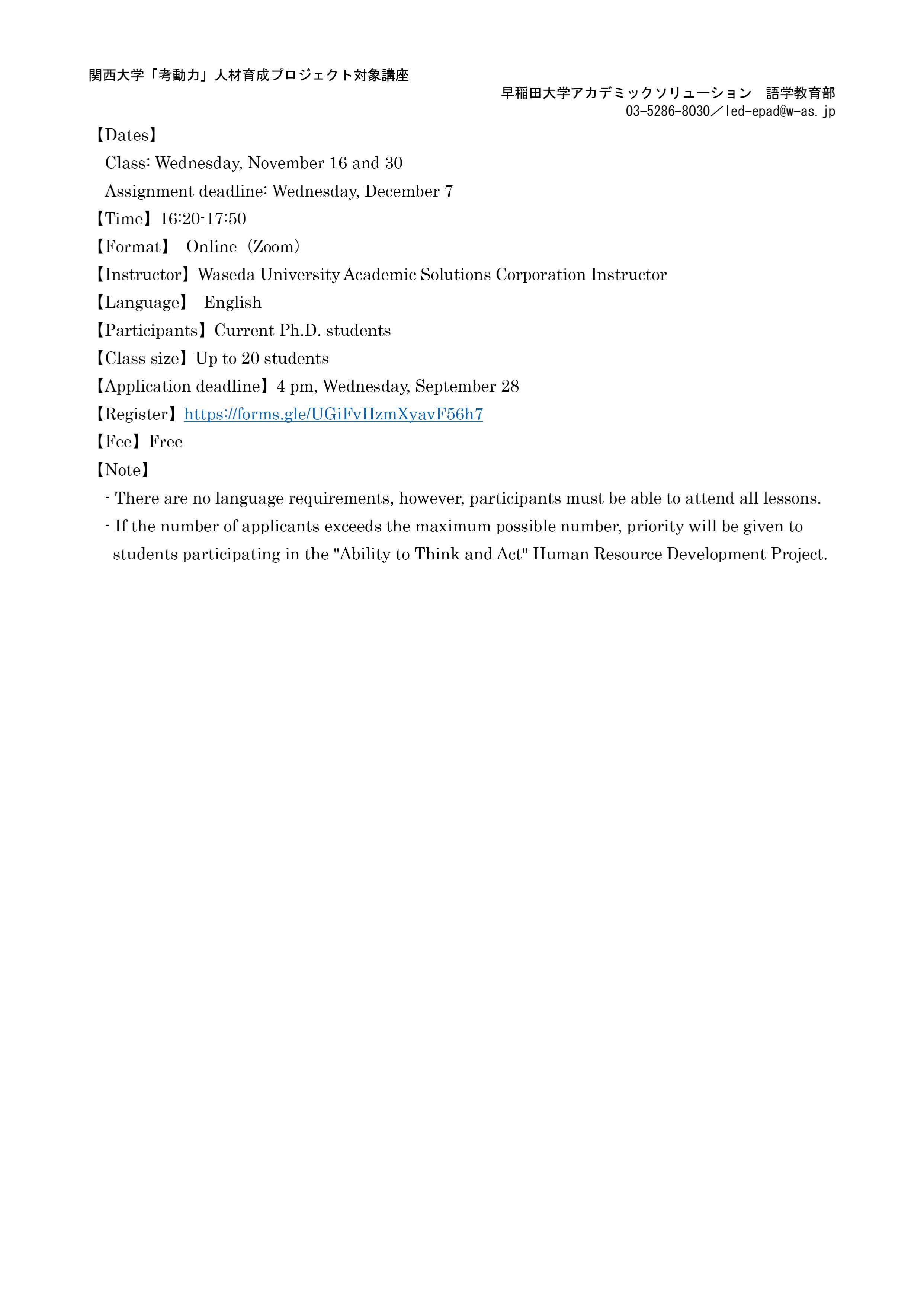2022/10/06 【博士後期課程/博士課程前期(修士)課程在学生向け】英語論文執筆のためのアカデミックライティング」講座