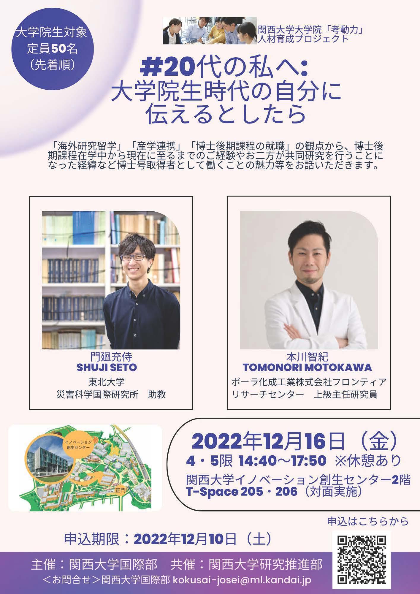 関西大学大学院「考動力」人材育成プロジェクトでは、このたび「#20代の私へ:大学院生時代の自分に伝えるとしたら」と題して、本学大学院生を対象に、海外研究活動に関する講演会を行います。