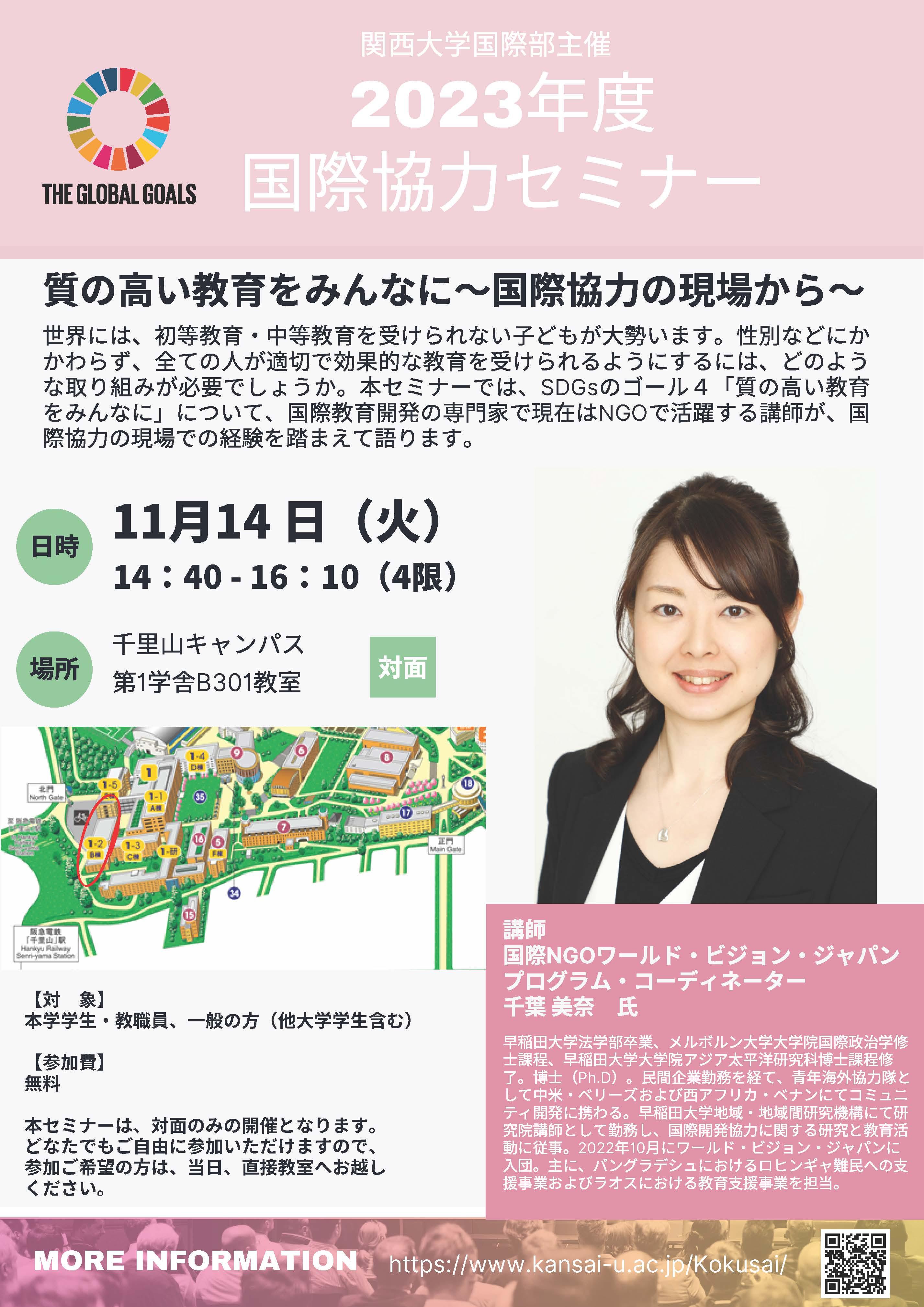 2023/10/27 2023年度 秋学期国際協力セミナー「質の高い教育をみんなに~国際協力の現場から~」を開催します!