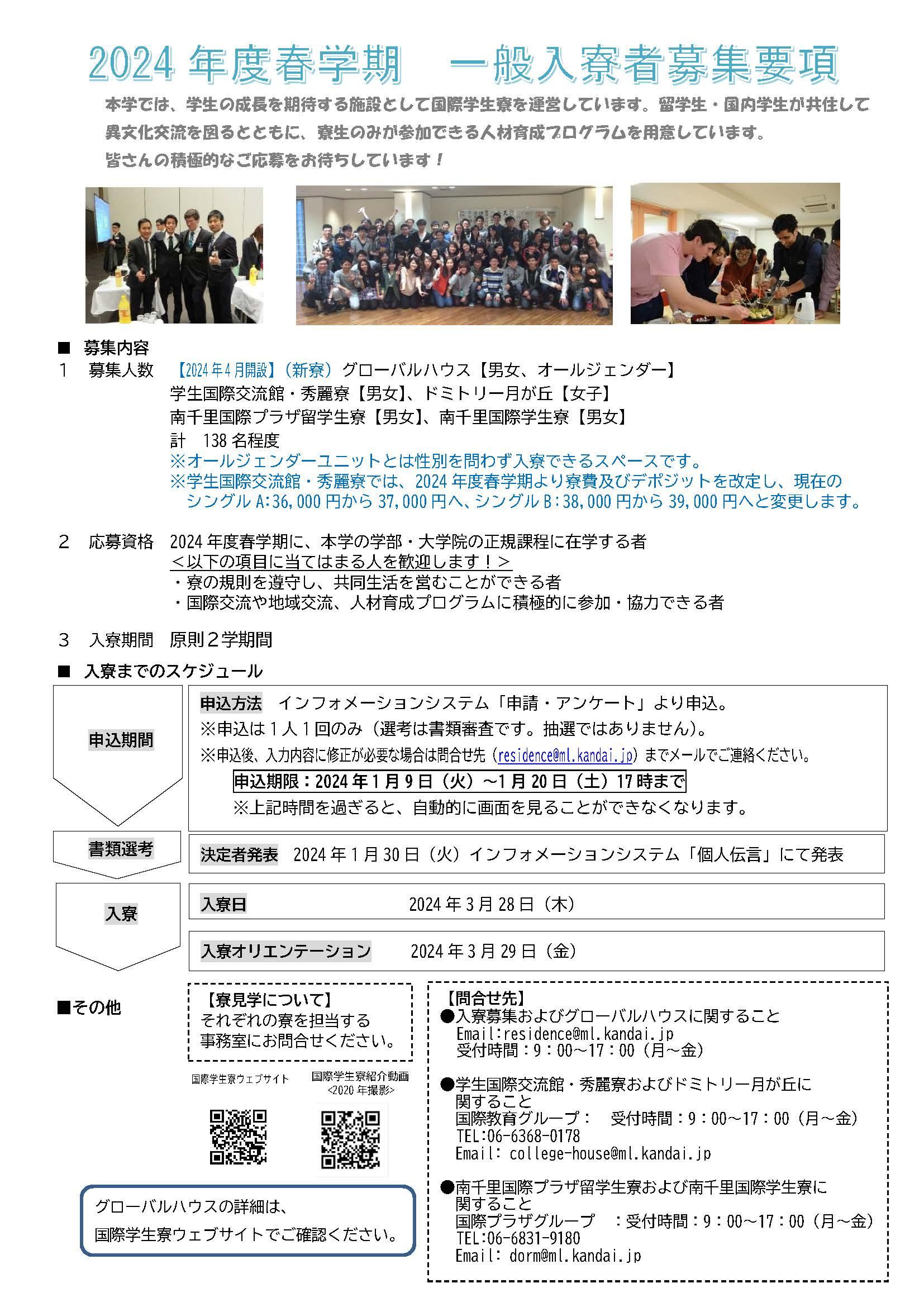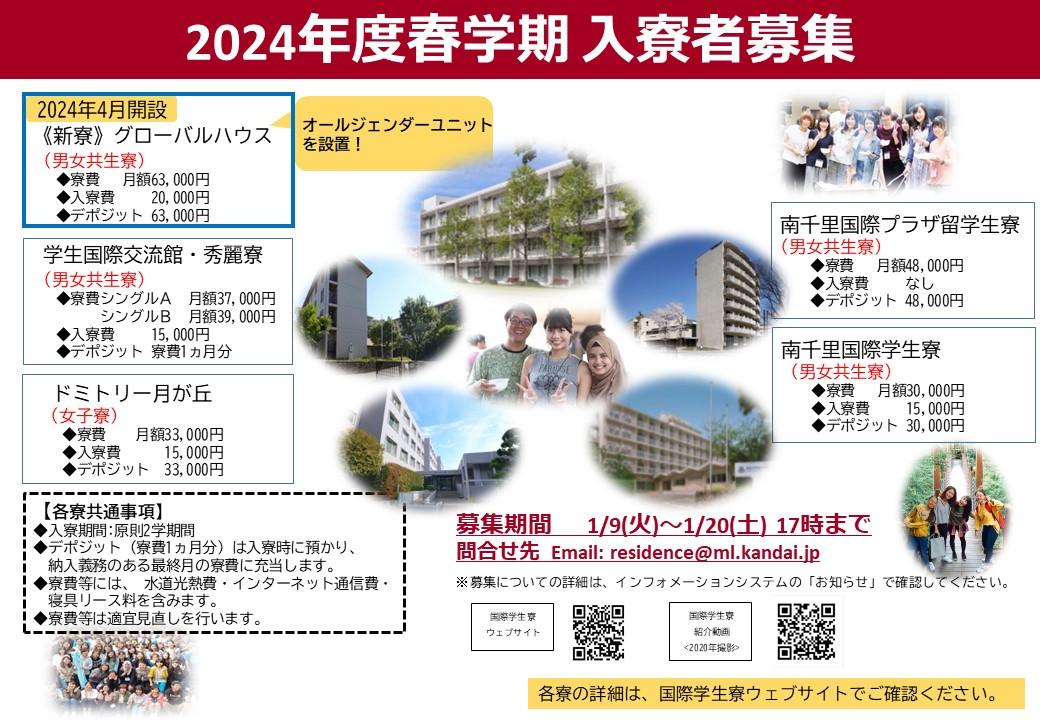 2023/12/05 2024年度春学期 国際学生寮 一般入寮者募集(在学生対象)について