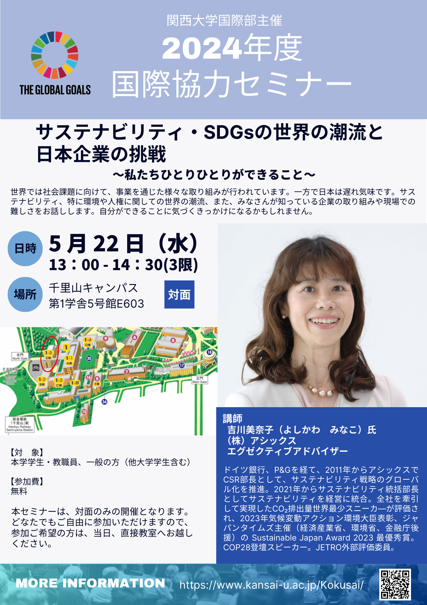 2024/05/08 2024年度 春学期国際協力セミナー「サステナビリティ・SDGsの世界の潮流と日本企業の挑戦~私たちひとりひとりができること~」を開催します!