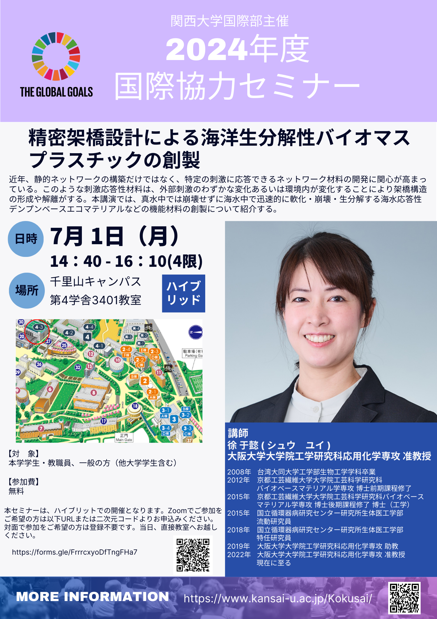 今回は、大阪大学 大学院工学研究科 応用化学専攻 准教授 徐 于懿 ( シュウ ユイ )氏をお迎えし、「精密架橋設計による海洋生分解性バイオマスプラスチックの創製」をテーマとしたセミナーを企画しました。