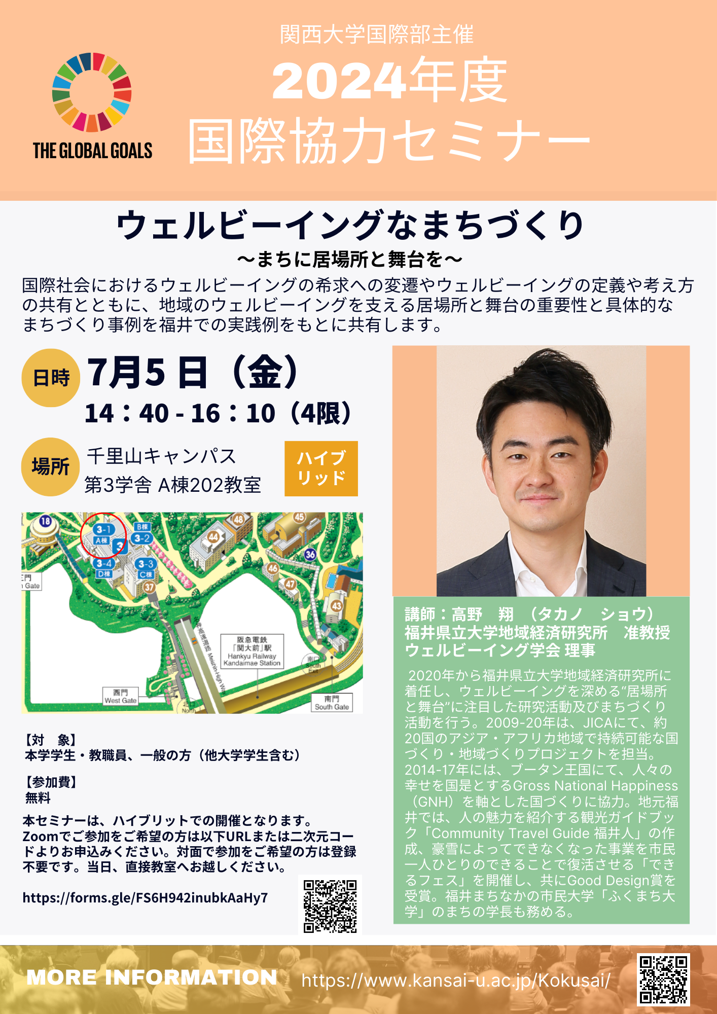 2024/06/18 2024年度 春学期国際協力セミナー「ウェルビーイングなまちづくり〜まちに居場所と舞台を〜」を開催します!
