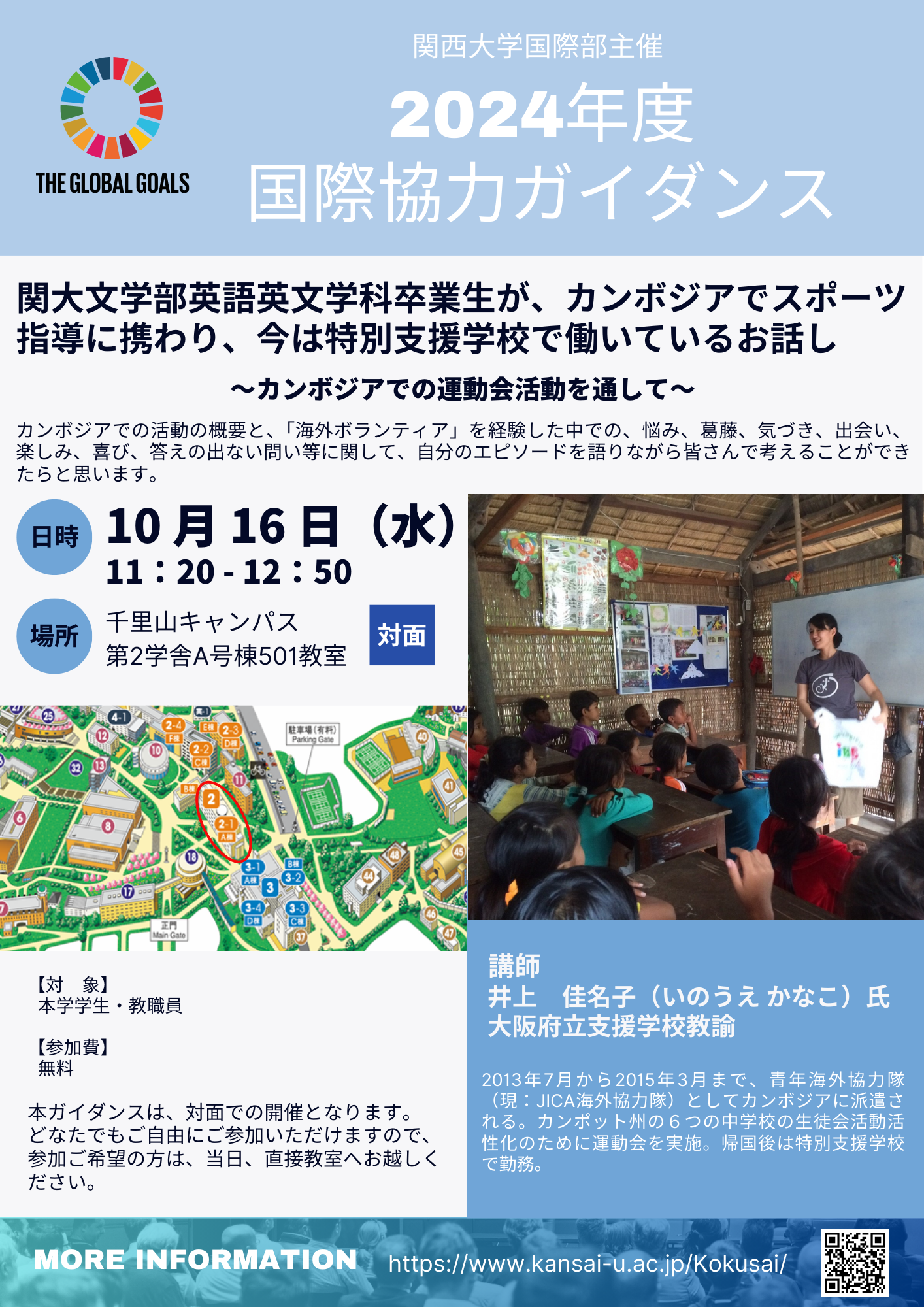 2024/10/04 2024年度 秋学期国際協力ガイダンス「関大文学部英語英文学科卒業生が、カンボジアでスポーツ指導に携わり、今は特別支援学校で働いているお話し~カンボジアでの運動会活動を通して~」を開催します!