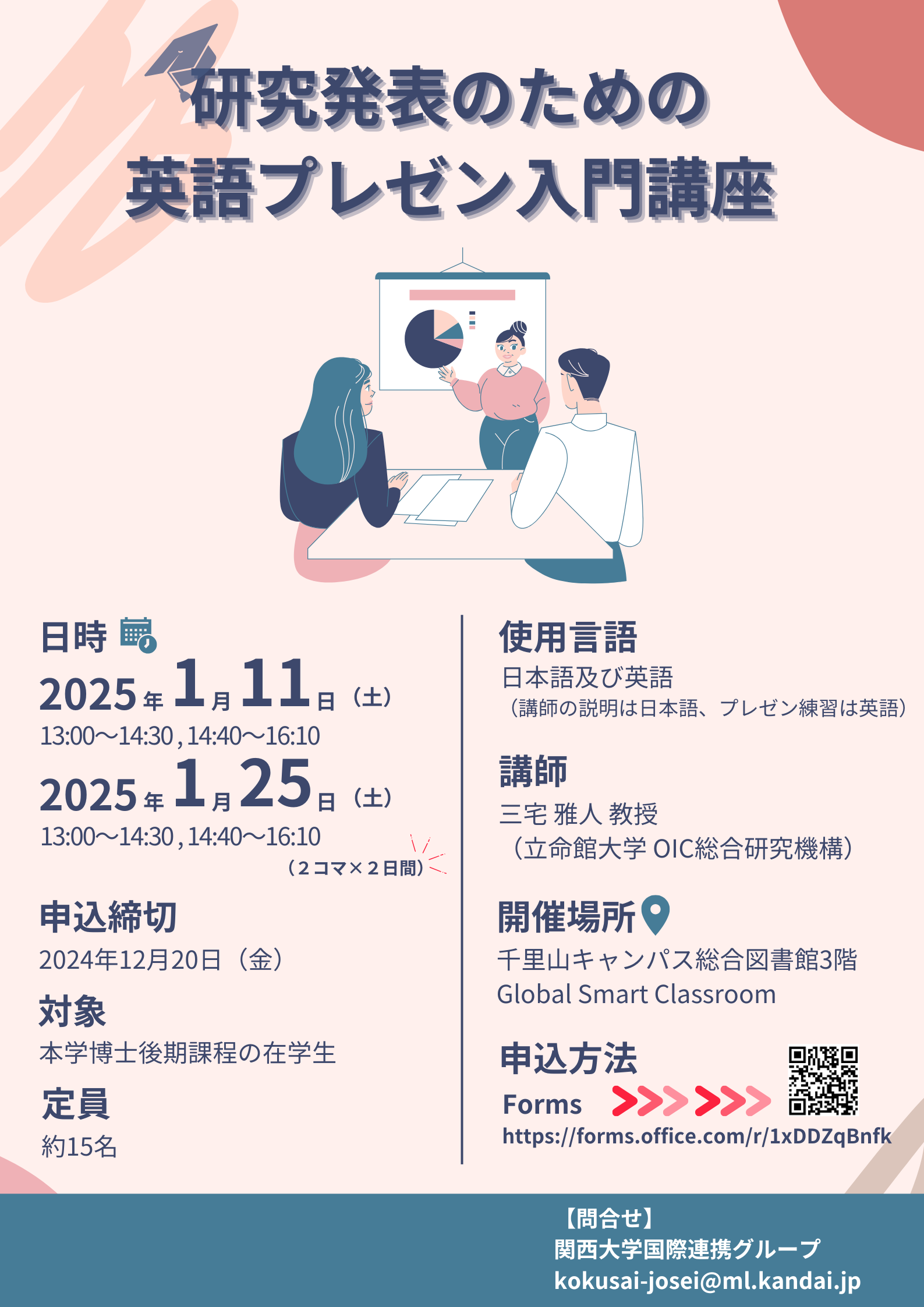 関西大学国際部では、国際学会での発表を希望する博士課程後期課程の在学生を対象に、以下の要領で、ポスター発表のための英語プレゼン入門講座を実施します。詳細は添付ファイルをご覧ください。