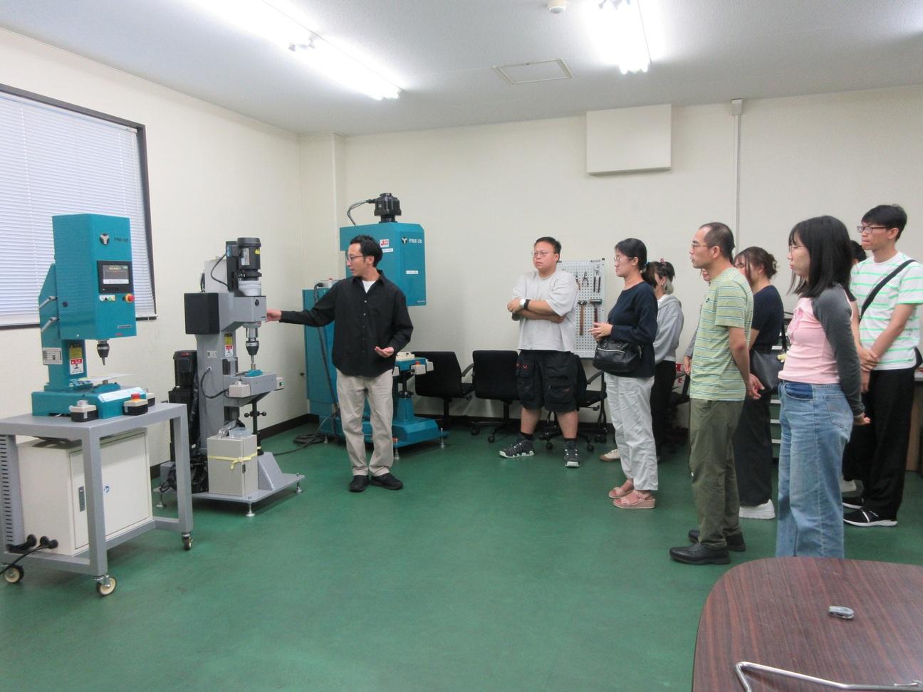 はじめに、リベッティングマシン及び周辺機器の開発・設計・製造・販売・特殊機・自動化ラインの開発・設計・製造・販売を行う総合システムメーカーである『吉川鐵工株式会社』様の本社と工場を訪問し、担当者の方から業務内容や工程、リベッティングに使用されている製品についてご説明いただいた後、実際に機械の操作を体験しました。