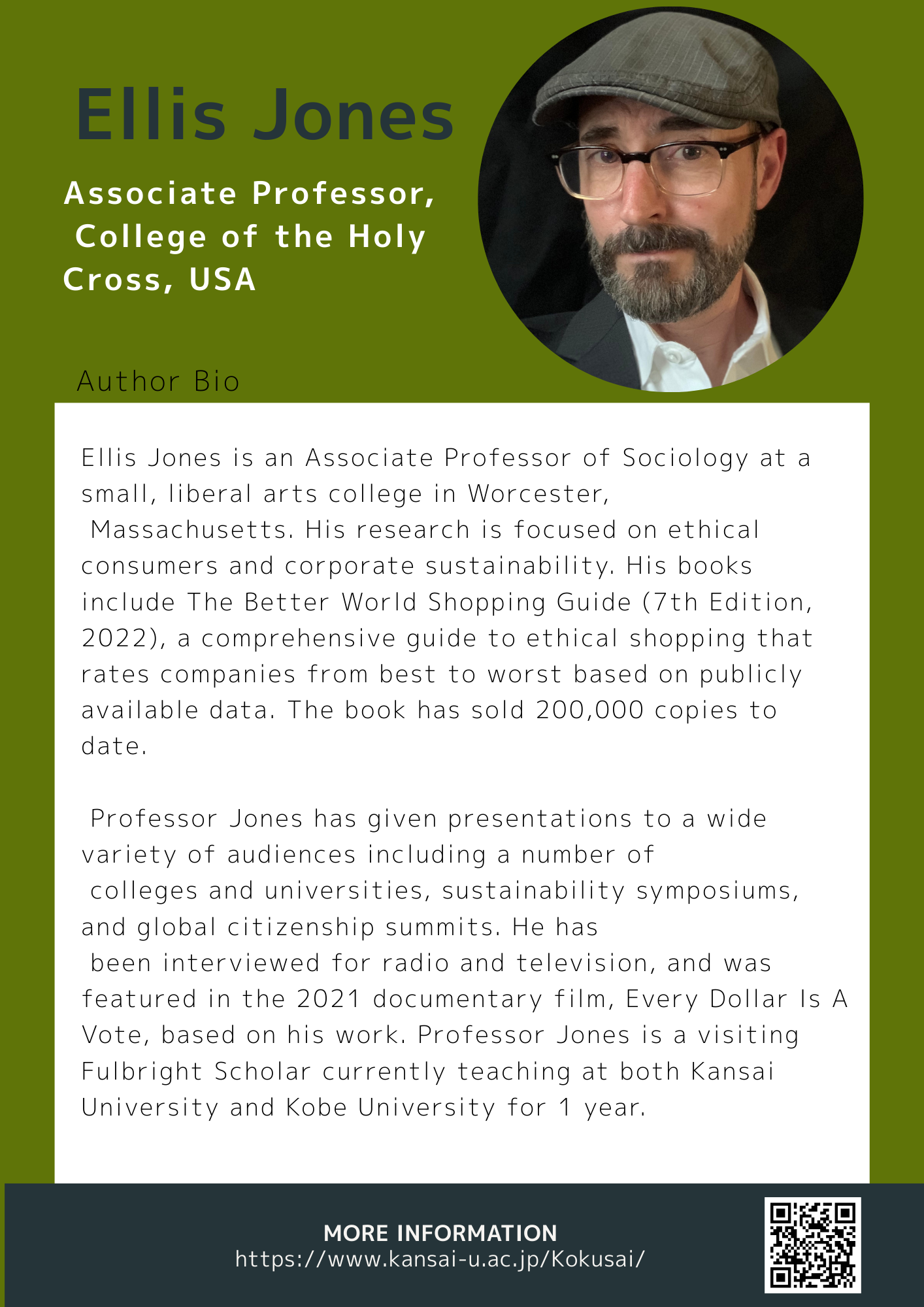 今回は、アメリカのホーリー・クロス大学 准教授Ellis Jones (エリス・ジョーンズ)氏をお迎えし、「Ethical Consumerism As An Essential Part Of Global Citizenship: Lessons Learned from 25 Years Of Public Research On Corporate Sustainability」をテーマとしたセミナーを企画しました。