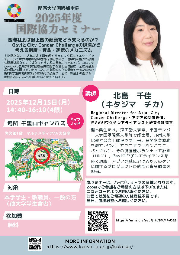 今回は、Regional Director for Asia, City Cancer Challenge・アジア統括責任者 北島千佳(キタジマ チカ)氏をお迎えし、「国際社会は途上国の健康をどう支えるのか?― GaviとCity Cancer Challengeの現場から考える制度・資金・連携のメカニズム」をテーマとしたセミナーを企画しました。