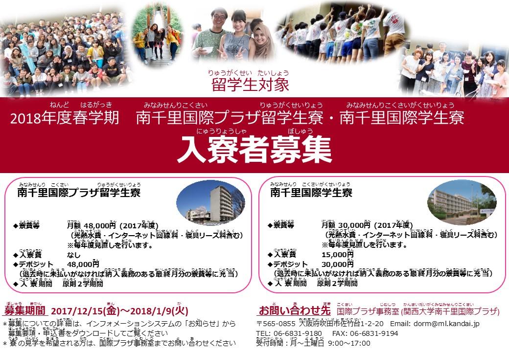 2017/12/18 【☆★留学生対象★☆】2018年度春学期 南千里国際プラザ留学生寮・南千里国際学生寮 入寮者募集