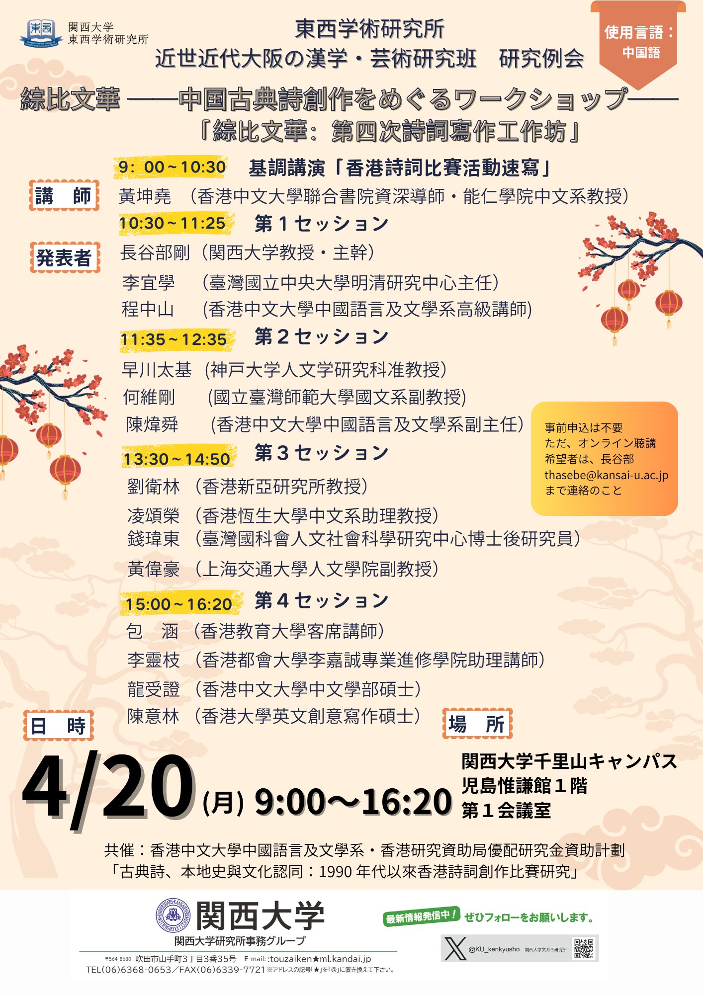 【ご案内】東西学術研究所【近世近代大阪の漢学・芸術研究班】研究例会開催のお知らせ(2026.4.20開催)