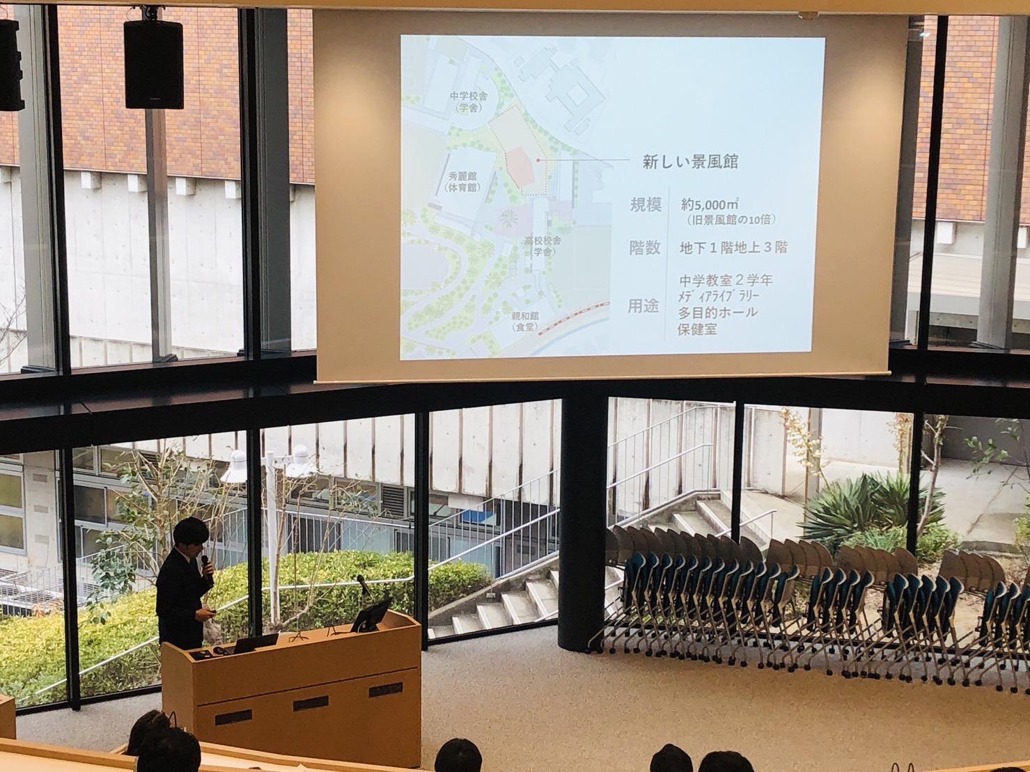 旧「景風館」は、1940年代後半から約30年にわたり、本学千里山キャンパスにおいて簡文館やITセンターなど40以上の建物を設計した建築家・村野藤吾の設計で、貴重な建築物ではありましたが、施設の老朽化や、耐震に係る現行法の適合のため、取り壊しを行い、今回、中学教室2学年とメディアライブラリー、多目的ホール等を擁する地下1階地上3階建の建物へと生まれ変わりました。