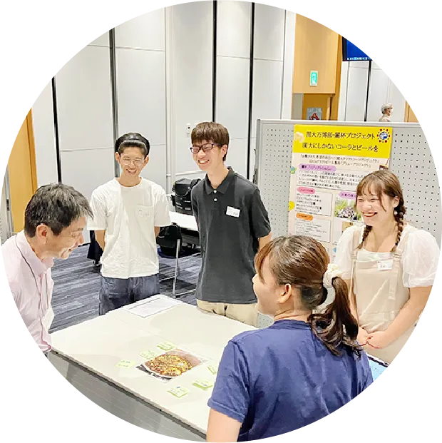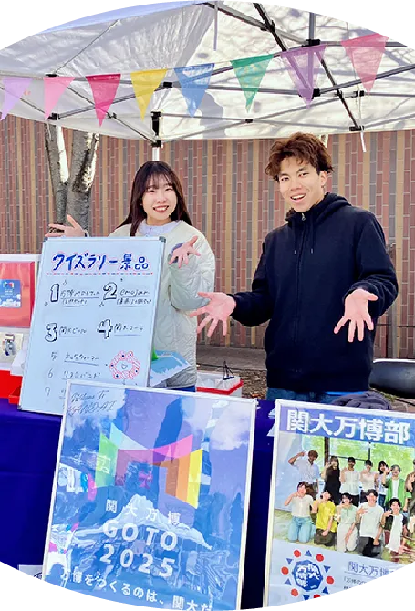 大阪・関西万博の機運醸成ならびに関西圏外の地域と万博を繋ぐことを目的とする独自の万博関連企画。関大万博部が運営メンバーの中心となって企画を推進し、他大学や企業、自治体など、産官学連携でキャンパス内に万博空間を創り上げます。特に6月末から7月頭にかけての1週間はメイン企画となる「関大万博フェスタ」を開催!「万博を知ってもらい」、そして「夢洲に行きたくなる」。そんなイベントが目白押し!さぁ、「関大万博」へおいでやす!