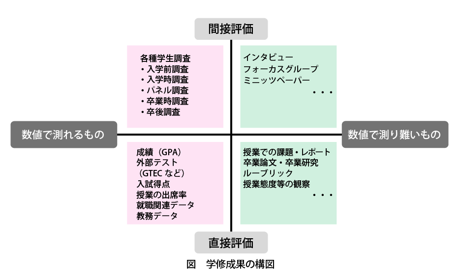 学内の各部局に点在する学生調査を一元化し、学生の学習行動(学習時間、意欲、満足度など)や学習到達度(コンピテンシー)を調査することによる間接評価と、成績や履修状況、正課外活動を調査することによる直接評価を実施しています。