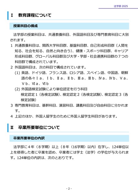 Ⅰ教育課程について授業科目の構成法学部2025法学部の授業科目は、共通教養科目、外国語科目及び専門教育科目に大別されます。1共通教養科目は、関西大学科目群、基盤科目群、自己形成科目群(人間を知る、社会を知る、自然と向き合う)、健康・スポーツ科目群、キャリア形成科目群、グローバル科目群及び大学・学部・社会連携科目群の7つの科目群で構成されています。2外国語科目は、次の科目で構成されています。(1)英語、ドイツ語、フランス語、ロシア語、スペイン語、中国語、朝鮮語の各々Ⅰa、Ⅰb、Ⅱa、Ⅱb、Ⅲa、Ⅲb、Ⅳa、Ⅳb、Ⅴa、Ⅴb、Ⅵa、Ⅵb(2)外国語検定試験により単位認定を行う科目検定認定1(各検定試験)、検定認定2(各検定試験)、検定認定3(各検定試験)3専門教育科目は、基幹科目、演習科目、講義科目及び自由科目に分かれます。4上記のほか、外国人留学生のために外国人留学生科目があります。卒業所要単位についてⅡ卒業所要単位の内訳法学部に4年〈8学期〉以上(8年〈16学期〉以内)在学し、124単位以上を修得した者に卒業を認め、卒業者には学士(法学)の学位が与えられます。124単位の内訳は、次のとおりです。-2-