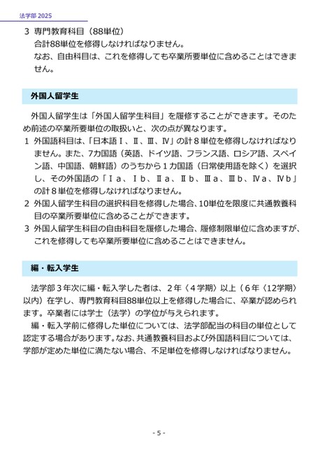 法学部20253専門教育科目(88単位)合計88単位を修得しなければなりません。なお、自由科目は、これを修得しても卒業所要単位に含めることはできません。外国人留学生外国人留学生は「外国人留学生科目」を履修することができます。そのため前述の卒業所要単位の取扱いと、次の点が異なります。1外国語科目は、「日本語Ⅰ、Ⅱ、Ⅲ、Ⅳ」の計8単位を修得しなければなりません。また、7カ国語(英語、ドイツ語、フランス語、ロシア語、スペイン語、中国語、朝鮮語)のうちから1カ国語(日常使用語を除く)を選択し、その外国語の「Ⅰa、Ⅰb、Ⅱa、Ⅱb、Ⅲa、Ⅲb、Ⅳa、Ⅳb」の計8単位を修得しなければなりません。2外国人留学生科目の選択科目を修得した場合、10単位を限度に共通教養科目の卒業所要単位に含めることができます。3外国人留学生科目の自由科目を履修した場合、履修制限単位に含めますが、これを修得しても卒業所要単位に含めることはできません。編・転入学生法学部3年次に編・転入学した者は、2年〈4学期〉以上(6年〈12学期〉以内)在学し、専門教育科目88単位以上を修得した場合に、卒業が認められます。卒業者には学士(法学)の学位が与えられます。編・転入学前に修得した単位については、法学部配当の科目の単位として認定する場合があります。なお、共通教養科目および外国語科目については、学部が定めた単位に満たない場合、不足単位を修得しなければなりません。-5-