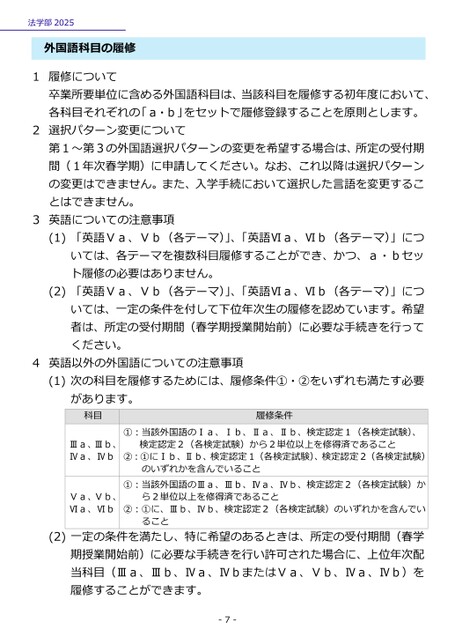 法学部2025外国語科目の履修1履修について卒業所要単位に含める外国語科目は、当該科目を履修する初年度において、各科目それぞれの「a・b」をセットで履修登録することを原則とします。2選択パターン変更について第1~第3の外国語選択パターンの変更を希望する場合は、所定の受付期間(1年次春学期)に申請してください。なお、これ以降は選択パターンの変更はできません。また、入学手続において選択した言語を変更することはできません。3英語についての注意事項(1)「英語Ⅴa、Ⅴb(各テーマ)」、「英語Ⅵa、Ⅵb(各テーマ)」については、各テーマを複数科目履修することができ、かつ、a・bセット履修の必要はありません。(2)「英語Ⅴa、Ⅴb(各テーマ)」、「英語Ⅵa、Ⅵb(各テーマ)」については、一定の条件を付して下位年次生の履修を認めています。希望者は、所定の受付期間(春学期授業開始前)に必要な手続きを行ってください。4英語以外の外国語についての注意事項(1)次の科目を履修するためには、履修条件①・②をいずれも満たす必要があります。科目履修条件Ⅲa、Ⅲb、Ⅳa、ⅣbⅤa、Ⅴb、Ⅵa、Ⅵb①:当該外国語のⅠa、Ⅰb、Ⅱa、Ⅱb、検定認定1(各検定試験)、検定認定2(各検定試験)から2単位以上を修得済であること②:①にⅠb、Ⅱb、検定認定1(各検定試験)、検定認定2(各検定試験)のいずれかを含んでいること①:当該外国語のⅢa、Ⅲb、Ⅳa、Ⅳb、検定認定2(各検定試験)から2単位以上を修得済であること②:①に、Ⅲb、Ⅳb、検定認定2(各検定試験)のいずれかを含んでいること(2)一定の条件を満たし、特に希望のあるときは、所定の受付期間(春学期授業開始前)に必要な手続きを行い許可された場合に、上位年次配当科目(Ⅲa、Ⅲb、Ⅳa、ⅣbまたはⅤa、Ⅴb、Ⅳa、Ⅳb)を履修することができます。-7-