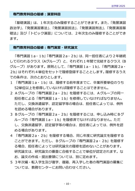 専門教育科目の履修:演習科目法学部2025「基礎演習」は、1年次生のみ履修することができます。また、「発展演習政治学」、「発展演習憲法」、「発展演習民法」、「発展演習刑法」、「発展演習基礎法」及び「トピック演習」については、2年次生のみ履修することができます。専門教育科目の履修:専門演習・研究論文「専門演習1a・1b」「専門演習2a・2b」は、同一担任者により2年継続して行われるクラス(Aグループ)と、それぞれ1年間で完結するクラス(Bグループ)があります。原則として、「専門演習1a・1b」、「専門演習2a・2b」はそれぞれ4単位をセットで履修登録することとします。履修するうえでの条件は、次のとおりとします。1「専門演習1a・1b」は、履修する前年度までに、卒業所要単位のうち52単位以上を修得していなければ履修することはできません。2Aグループの「専門演習2a・2b」を履修するには、Aグループの同一担任者による「専門演習1a・1b」を修得していなければなりません。ただし、交換派遣留学、認定留学等の場合は、担任者によっては、例外を認める場合があります。3Bグループの「専門演習2a・2b」を履修するには、申し込み時にBグループの「専門演習1a・1b」を履修済でなければなりません。ただし、交換派遣留学、認定留学等の場合は、担任者によっては、例外を認める場合があります。4「専門演習2a・2b」を履修する場合、同じ年度に研究論文を履修することができます。ただし、Bグループの「専門演習2a・2b」を履修する場合、担任者によっては研究論文の履修を認めないことがあります。研究論文は、研究論文の審査に合格することで単位が認定されます。なお、論文の作成・提出要領については、別に定めます。53年次編・転入学生及び復学、復籍、再入学した者の専門演習の募集については、教務センターにお問い合わせください。-10-