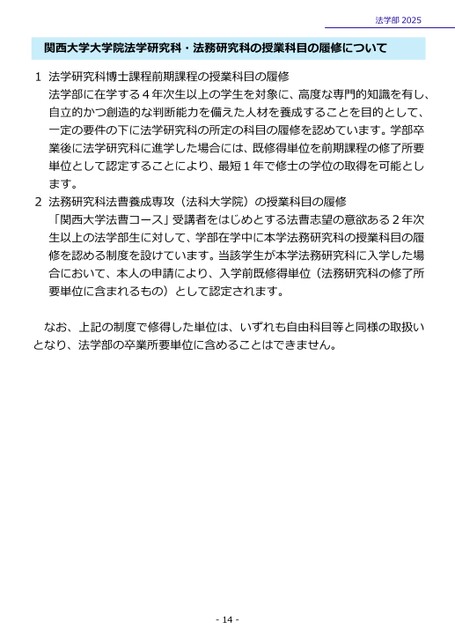 関西大学大学院法学研究科・法務研究科の授業科目の履修について1法学研究科博士課程前期課程の授業科目の履修法学部に在学する4年次生以上の学生を対象に、高度な専門的知識を有し、自立的かつ創造的な判断能力を備えた人材を養成することを目的として、一定の要件の下に法学研究科の所定の科目の履修を認めています。学部卒業後に法学研究科に進学した場合には、既修得単位を前期課程の修了所要単位として認定することにより、最短1年で修士の学位の取得を可能とします。2法務研究科法曹養成専攻(法科大学院)の授業科目の履修「関西大学法曹コース」受講者をはじめとする法曹志望の意欲ある2年次生以上の法学部生に対して、学部在学中に本学法務研究科の授業科目の履修を認める制度を設けています。当該学生が本学法務研究科に入学した場合において、本人の申請により、入学前既修得単位(法務研究科の修了所要単位に含まれるもの)として認定されます。お、上記の制度で修得した単位は、いずれも自由科目等と同様の取扱いなとなり、法学部の卒業所要単位に含めることはできません。法学部2025-14-