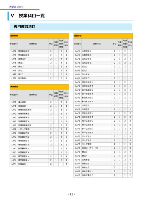 -15-法学部2025Ⅴ授業科目一覧専門教育科目基幹科目科目番号授業科目単位期間授業時間毎週授業年次配当LAP1現代政治論12121LAP1現代政治論22121LAP1基礎法学2121LAP1憲法12121LAP1憲法22121LAP1民法12121LAP1民法22121LAP1刑法各論2121演習科目科目番号授業科目単位授業期間授業毎週時間配当年次LAP1導入演習2121LAP1基礎演習2121LAP2発展演習政治学2122LAP2発展演習憲法2122LAP2発展演習民法2122LAP2発展演習刑法2122LAP2発展演習基礎法2122LAP2トピック演習2122LAP2外国書研究12122LAP2外国書研究22122LAP3専門演習1a2123LAP3専門演習1b2123LAP3外国書研究32123LAP3外国書研究42123LAP4専門演習2a2124LAP4専門演習2b2124LAP4研究論文2ーー4講義科目科目番号授業科目単位期間授業時間毎週授業年次配当LAP1法思想史12121LAP1法思想史22121LAP1法社会学12121LAP1法社会学22121LAP1民法32121LAP1民法72121LAP1刑法総論2121LAP1法学入門2121LAP1日本政治史12121LAP1日本政治史22121LAP1西洋政治史12121LAP1西洋政治史22121LAP1政治思想史12121LAP1政治思想史22121LAP2法哲学12122LAP2法哲学22122LAP2日本法制史12122LAP2日本法制史22122LAP2東洋法制史12122LAP2東洋法制史22122LAP2西洋法制史12122LAP2西洋法制史22122LAP3ローマ法12123LAP3ローマ法22123LAP3法と経済学2123LAP3外国法(各テーマ)2123LAP2憲法32122LAP2憲法42122LAP3比較憲法2123LAP2行政法12122LAP2行政法22122LAP2行政救済法12122LAP2行政救済法22122