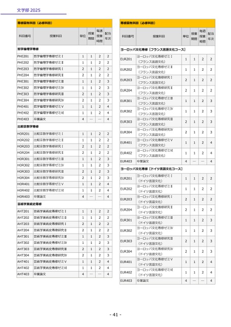 文学部2025-41-専修固有科目(必修科目)科目番号授業科目単位授業期間授業毎週時間配当年次哲学倫理学専修PHE201哲学倫理学専修ゼミⅠ1122PHE202哲学倫理学専修ゼミⅡ1122PHE203哲学倫理学専修研究Ⅰ2122PHE204哲学倫理学専修研究Ⅱ2122PHE301哲学倫理学専修ゼミⅢ1123PHE302哲学倫理学専修ゼミⅣ1123PHE303哲学倫理学専修研究Ⅲ2123PHE304哲学倫理学専修研究Ⅳ2123PHE401哲学倫理学専修ゼミⅤ1124PHE402哲学倫理学専修ゼミⅥ1124PHE403卒業論文4――4比較宗教学専修HOR201比較宗教学専修ゼミⅠ1122HOR202比較宗教学専修ゼミⅡ1122HOR203比較宗教学専修研究Ⅰ2122HOR204比較宗教学専修研究Ⅱ2122HOR301比較宗教学専修ゼミⅢ1123HOR302比較宗教学専修ゼミⅣ1123HOR303比較宗教学専修研究Ⅲ2123HOR304比較宗教学専修研究Ⅳ2123HOR401比較宗教学専修ゼミⅤ1124HOR402比較宗教学専修ゼミⅥ1124HOR403卒業論文4――4芸術学美術史専修AHT201芸術学美術史専修ゼミⅠ1122AHT202芸術学美術史専修ゼミⅡ1122AHT203芸術学美術史専修研究Ⅰ2122AHT204芸術学美術史専修研究Ⅱ2122AHT301芸術学美術史専修ゼミⅢ1123AHT302芸術学美術史専修ゼミⅣ1123AHT303芸術学美術史専修研究Ⅲ2123AHT304芸術学美術史専修研究Ⅳ2123AHT401芸術学美術史専修ゼミⅤ1124AHT402芸術学美術史専修ゼミⅥ1124AHT403卒業論文4――4専修固有科目(必修科目)科目番号授業科目単位授業期間授業毎週時間配当年次ヨーロッパ文化専修[フランス言語文化コース]EUR201(フランス言語文化)ヨーロッパ文化専修ゼミⅥヨーロッパ文化専修ゼミⅤ(フランス言語文化)(フランス言語文化)ヨーロッパ文化専修研究Ⅲ(フランス言語文化)(フランス言語文化)ヨーロッパ文化専修ゼミⅢ(フランス言語文化)(フランス言語文化)ヨーロッパ文化専修研究Ⅰ(フランス言語文化)(フランス言語文化)ヨーロッパ文化専修ゼミⅠヨーロッパ文化専修ゼミⅡヨーロッパ文化専修研究Ⅱヨーロッパ文化専修ゼミⅣヨーロッパ文化専修研究Ⅳ(フランス言語文化)卒業論文1122EUR2021122EUR2032122EUR2042122EUR3011123EUR3021123EUR3032123EUR3042123EUR4011124EUR4021124EUR4034――4ヨーロッパ文化専修[ドイツ言語文化コース]EUR201(ドイツ言語文化)ヨーロッパ文化専修ゼミⅥヨーロッパ文化専修ゼミⅤ(ドイツ言語文化)ヨーロッパ文化専修研究Ⅳヨーロッパ文化専修研究Ⅲ(ドイツ言語文化)ヨーロッパ文化専修ゼミⅣヨーロッパ文化専修ゼミⅢ(ドイツ言語文化)(ドイツ言語文化)ヨーロッパ文化専修研究Ⅰ(ドイツ言語文化)(ドイツ言語文化)ヨーロッパ文化専修ゼミⅠヨーロッパ文化専修ゼミⅡヨーロッパ文化専修研究Ⅱ(ドイツ言語文化)(ドイツ言語文化)(ドイツ言語文化)卒業論文1122EUR2021122EUR2032122EUR2042122EUR3011123EUR3021123EUR3032123EUR3042123EUR4011124EUR4021124EUR4034――4