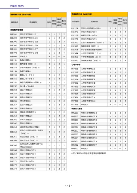 文学部2025-43-専修固有科目(必修科目)科目番号授業科目単位授業期間授業毎週時間配当年次初等教育学専修ELE201初等教育学専修ゼミⅠ1122ELE202初等教育学専修ゼミⅡ1122ELE301初等教育学専修ゼミⅢ1123ELE302初等教育学専修ゼミⅣ1123ELE401初等教育学専修ゼミⅤ1124ELE402初等教育学専修ゼミⅥ1124ELE403卒業論文4―ー4ELE151教職の実際※2121ELE152教育原理(初等)※2121ELE153学習・発達論(初等)※2121ELE154教育政策論※2121ELE155教職リサーチⅠ※2121ELE156教職リサーチⅡ※2121ELE251特別支援教育論(初等)※2122ELE252カリキュラム論※2122ELE253国語科教育法※2122ELE254社会科教育法※2122ELE255算数科教育法※2122ELE256理科教育法※2122ELE257生活科教育法※2122ELE258音楽科教育法※2122ELE259図画工作科教育法※2122ELE260家庭科教育法※2122ELE261体育科教育法※2122ELE262英語科教育法※2122ELE263特別活動論(初等)※総合的な学習の時間の指導法道徳教育の理論と実践※(初等)※2122ELE2642122ELE2652122ELE266理論及び方法※教育方法学(初等)※ICTを活用した教育に関する国語科教育の内容※2122ELE2671122ELE2682122ELE269社会科教育の内容※2122ELE270算数科教育の内容※2122ELE271理科教育の内容※2122ELE272生活科教育の内容※2122ELE273音楽科教育の内容※2122専修固有科目(必修科目)科目番号授業科目単位授業期間授業毎週時間配当年次ELE274図画工作科教育の内容※2122ELE275家庭科教育の内容※2122ELE276体育科教育の内容※2122ELE278英語科教育の内容※2122ELE351生徒・進路指導論(初等)※2123ELE352教育相談論(初等)※2123ELE353小学校教育実習事前指導※1123ELE354小学校教育実習(一)※2123ELE355小学校教育実習(二)※2123ELE451教職実践演習(初等)※2124心理学専修PSY201心理学専修ゼミⅠ1122PSY202心理学専修ゼミⅡ1122PSY203心理学専修研究Ⅰ2122PSY204心理学専修研究Ⅱ2122PSY301心理学専修ゼミⅢ1123PSY302心理学専修ゼミⅣ1123PSY303心理学専修研究Ⅲ2123PSY304心理学専修研究Ⅳ2123PSY401心理学専修ゼミⅤ1124PSY402心理学専修ゼミⅥ1124PSY403卒業論文4――4映像文化専修FMS201映像文化専修ゼミⅠ1122FMS202映像文化専修ゼミⅡ1122FMS203映像文化専修研究Ⅰ2122FMS204映像文化専修研究Ⅱ2122FMS301映像文化専修ゼミⅢ1123FMS302映像文化専修ゼミⅣ1123FMS303映像文化専修研究Ⅲ2123FMS304映像文化専修研究Ⅳ2123FMS401映像文化専修ゼミⅤ1124FMS402映像文化専修ゼミⅥ1124FMS403卒業論文4――4※印の科目は初等教育学専修選択科目