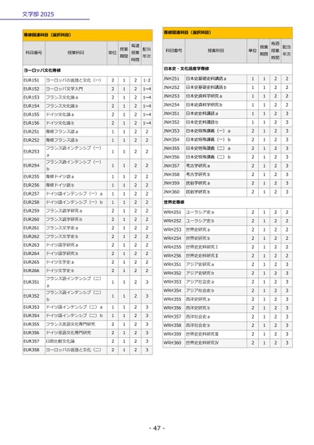 文学部2025-47-専修関連科目(選択科目)科目番号授業科目単位授業期間授業毎週時間配当年次ヨーロッパ文化専修EUR151ヨーロッパの言語と文化(一)2121・2EUR152ヨーロッパ文学入門2121~4EUR153フランス文化論a2121~4EUR154フランス文化論b2121~4EUR155ドイツ文化論a2121~4EUR156ドイツ文化論b2121~4EUR251専修フランス語a1122EUR252bフランス語インテンシブ(一)a専修フランス語bフランス語インテンシブ(一)専修ドイツ語a1122EUR2531122EUR2541122EUR2551122EUR256専修ドイツ語b1122EUR257ドイツ語インテンシブ(一)a1122EUR258ドイツ語インテンシブ(一)b1122EUR259フランス語学研究a2122EUR260フランス語学研究b2122EUR261フランス文学史a2122EUR262フランス文学史b2122EUR263ドイツ語学研究a2122EUR264ドイツ語学研究b2122EUR265ドイツ文学史a2122EUR266bフランス語インテンシブ(二)aドイツ文学史bフランス語インテンシブ(二)ドイツ語インテンシブ(二)a2122EUR3511123EUR3521123EUR3531123EUR354ドイツ語インテンシブ(二)b1123EUR355フランス言語文化専門研究2123EUR356ドイツ言語文化専門研究2123EUR357日欧比較文化論2123EUR358ヨーロッパの言語と文化(二)2123専修関連科目(選択科目)科目番号授業科目単位授業期間授業毎週時間配当年次日本史・文化遺産学専修JNH251日本史基礎史料講読a1122JNH252日本史基礎史料講読b1122JNH253日本史資料学研究a1122JNH254日本史資料学研究b1122JNH351日本史史料講読a1123JNH352日本史史料講読b1123JNH353日本史特殊講義(一)a2123JNH354日本史特殊講義(一)b2123JNH355日本史特殊講義(二)a2123JNH356日本史特殊講義(二)b2123JNH357考古学研究a2123JNH358考古学研究b2123JNH359民俗学研究a2123JNH360民俗学研究b2123世界史専修WRH251ユーラシア史a2122WRH252ユーラシア史b2122WRH253世界史研究a2122WRH254世界史研究b2122WRH255世界史史料研究Ⅰ2122WRH256世界史史料研究Ⅱ2122WRH351アジア史研究a2123WRH352アジア史研究b2123WRH353アジア社会史a2123WRH354アジア社会史b2123WRH355西洋史研究a2123WRH356西洋史研究b2123WRH357西洋社会史a2123WRH358西洋社会史b2123WRH359世界史史料研究Ⅲ2123WRH360世界史史料研究Ⅳ2123