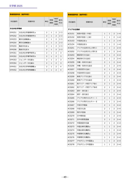 文学部2025専修関連科目(選択科目)科目番号授業科目文化共生学専修SYM251SYM252SYM253SYM254SYM255SYM256SYM351SYM352SYM353SYM354SYM451SYM452文化共生学基礎研究a文化共生学基礎研究b異文化接触論a異文化接触論b風俗文化史a風俗文化史b文化共生学専門研究a文化共生学専門研究bジェンダー文化論aジェンダー文化論b文化共生学特殊講義a文化共生学特殊講義b単位授業期間毎週授業時間配当年次2222222222221111111111112222222222222・32・32・32・32・32・3333344専修関連科目(選択科目)科目番号授業科目アジア文化専修単位授業期間毎週授業時間配当年次ACS151ACS152ACS153ACS154ACS251ACS252ACS253ACS254ACS255ACS256ACS257ACS258ACS259ACS260ACS261ACS262ACS263ACS264ACS265ACS266ACS267ACS268ACS269ACS270ACS271ACS272ACS273ACS274ACS275ACS276ACS277ACS278実践中国語(中級)実践中国語(上級)中国語会話a中国語会話bアジアの伝統文化と現代Ⅰアジアの伝統文化と現代Ⅱ韓国現代文化論Ⅰ韓国現代文化論Ⅱ沖縄・琉球文化論Ⅰ沖縄・琉球文化論Ⅱ中国思想文化論Ⅰ中国思想文化論Ⅱ東南アジア文化論Ⅰ東南アジア文化論Ⅱ南アジア・内陸アジア論Ⅰ南アジア・内陸アジア論Ⅱ漢字・漢文論Ⅰ漢字・漢文論Ⅱアジアの現代カルチャーⅠアジアの現代カルチャーⅡ中国文学概論中国文化論現代中国論日中関係論日中対照言語論中国言語文化論中国古典文講読a中国古典文講読b中国現代文講読a中国現代文講読bアカデミック中国語aアカデミック中国語b1111222222222222222222222211111111111111111111111111111111111111222222222222222222222222222222221~41~41~41~42~42~42~42~42~42~42~42~42~42~42~42~42~42~42~42~42~42~42~42~42~42~42~42~42~42~42~42~4-49-