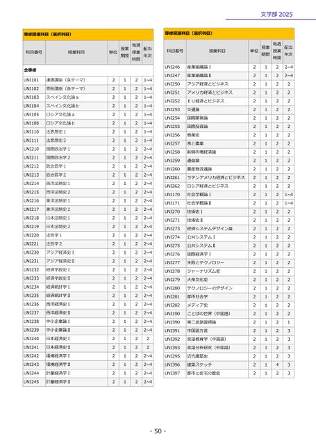 -50-文学部2025専修関連科目(選択科目)科目番号授業科目単位授業期間授業毎週時間配当年次全専修UNI101連携講座(各テーマ)2121~4UNI102寄附講座(各テーマ)2121~4UNI103スペイン文化論a2121~4UNI104スペイン文化論b2121~4UNI105ロシア文化論a2121~4UNI106ロシア文化論b2121~4UNI110法思想史12121~4UNI111法思想史22121~4UNI210国際政治学12122~4UNI211国際政治学22122~4UNI212政治哲学12122~4UNI213政治哲学22122~4UNI214西洋法制史12122~4UNI215西洋法制史22122~4UNI216東洋法制史12122~4UNI217東洋法制史22122~4UNI218日本法制史12122~4UNI219日本法制史22122~4UNI220法哲学12122~4UNI221法哲学22122~4UNI230アジア経済史Ⅰ2122~4UNI231アジア経済史Ⅱ2122~4UNI232経済学説史Ⅰ2122~4UNI233経済学説史Ⅱ2122~4UNI234経済統計学Ⅰ2122~4UNI235経済統計学Ⅱ2122~4UNI236西洋経済史Ⅰ2122~4UNI237西洋経済史Ⅱ2122~4UNI238中小企業論Ⅰ2122~4UNI239中小企業論Ⅱ2122~4UNI240日本経済史Ⅰ2122UNI241日本経済史Ⅱ2122UNI242環境経済学Ⅰ2122~4UNI243環境経済学Ⅱ2122~4UNI244計量経済学Ⅰ2122~4UNI245計量経済学Ⅱ2122~4専修関連科目(選択科目)科目番号授業科目単位授業期間授業毎週時間配当年次UNI246産業組織論Ⅰ2122~4UNI247産業組織論Ⅱ2122~4UNI250アジア経済とビジネス2122UNI251アメリカ経済とビジネス2122UNI252EU経済とビジネス2122UNI253交通論2122UNI254国際開発論2122UNI255国際投資論2122UNI256商業史2122UNI257食と農業2122UNI258新興市場経済論2122UNI259通信論2122UNI260農産物流通論2122UNI261ラテンアメリカ経済とビジネス2122UNI262ロシア経済とビジネス2122UNI170社会学概論Ⅰ2121~4UNI171社会学概論Ⅱ2121~4UNI270技術史Ⅰ2122UNI271技術史Ⅱ2122UNI273経済システムデザイン論2122UNI274公共システムⅠ2122UNI275公共システムⅡ2122UNI276国際経済学Ⅰ2122UNI277失敗とテクノロジー2122UNI278ジャーナリズム史2122UNI279大衆文化史2122UNI280テクノロジーのデザイン2122UNI281都市社会学2122UNI282メディア史2122UNI190ことばの世界(中国語)2122UNI390第二言語習得論2121UNI391中国語方言2123UNI392言語教育学(中国語)2123UNI393言語分析研究(中国語)2123UNI295近代建築史2123UNI396建築スケッチ2143UNI397都市と住宅の歴史2123