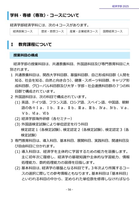 学科・専修(専攻)・コースについて経済学部2025経済学部経済学科には、次の4コースがあります。経済政策コース歴史・思想コース産業・企業経済コース国際経済コース教育課程についてⅠ授業科目の構成経済学部の授業科目は、共通教養科目、外国語科目及び専門教育科目に大別されます。1共通教養科目は、関西大学科目群、基盤科目群、自己形成科目群(人間を知る、社会を知る、自然と向き合う)、健康・スポーツ科目群、キャリア形成科目群、グローバル科目群及び大学・学部・社会連携科目群の7つの科目群で構成されています。2外国語科目は、次の科目で構成されています。(1)英語、ドイツ語、フランス語、ロシア語、スペイン語、中国語、朝鮮語の各々Ⅰa、Ⅰb、Ⅱa、Ⅱb、Ⅲa、Ⅲb、Ⅳa、Ⅳb、Ⅴa、Ⅴb、Ⅵa、Ⅵb(2)経済学部海外研修(各セミナー)(3)外国語検定試験により単位認定を行う科目検定認定1(各検定試験)、検定認定2(各検定試験)、検定認定3(各検定試験)3専門教育科目は、導入科目、基本科目、展開科目、実践科目、関連科目及び自由科目に分かれます。(1)導入科目は、経済学を主体的に学習するための能力を涵養します。主に初年次に履修し、経済学の基礎知識や主体的な学習能力、情報処理能力、数的処理能力の習得を目指します。(2)基本科目は、経済学の基盤となる科目です。3年次より所属するコースの選択に際しての参考情報ともなります。基本科目は「基本科目」といわれる科目の中から、定められた単位数を修得しなければなら-56-