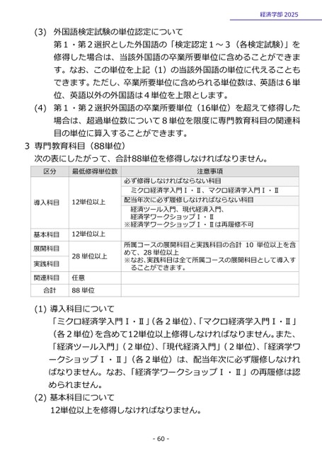 (3)(4)経済学部2025外国語検定試験の単位認定について第1・第2選択とした外国語の「検定認定1~3(各検定試験)」を修得した場合は、当該外国語の卒業所要単位に含めることができます。なお、この単位を上記(1)の当該外国語の単位に代えることもできます。ただし、卒業所要単位に含められる単位数は、英語は6単位、英語以外の外国語は4単位を上限とします。第1・第2選択外国語の卒業所要単位(16単位)を超えて修得した場合は、超過単位数について8単位を限度に専門教育科目の関連科目の単位に算入することができます。3専門教育科目(88単位)次の表にしたがって、合計88単位を修得しなければなりません。区分最低修得単位数導入科目12単位以上注意事項必ず修得しなければならない科目ミクロ経済学入門Ⅰ・Ⅱ、マクロ経済学入門Ⅰ・Ⅱ配当年次に必ず履修しなければならない科目経済ツール入門、現代経済入門、経済学ワークショップⅠ・Ⅱ※経済学ワークショップⅠ・Ⅱは再履修不可基本科目展開科目実践科目関連科目合計12単位以上28単位以上任意88単位所属コースの展開科目と実践科目の合計めて、28単位以上※なお、実践科目は全て所属コースの展開科目として導入す10単位以上を含ることができます。(1)導入科目について「ミクロ経済学入門Ⅰ・Ⅱ」(各2単位)、「マクロ経済学入門Ⅰ・Ⅱ」(各2単位)を含めて12単位以上修得しなければなりません。また、「経済ツール入門」(2単位)、「現代経済入門」(2単位)、「経済学ワークショップⅠ・Ⅱ」(各2単位)は、配当年次に必ず履修しなければなりません。なお、「経済学ワークショップⅠ・Ⅱ」の再履修は認められません。(2)基本科目について12単位以上を修得しなければなりません。-60-