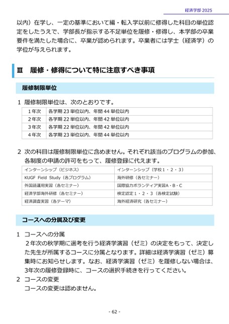 以内)在学し、一定の基準において編・転入学以前に修得した科目の単位認定をしたうえで、学部長が指示する不足単位を履修・修得し、本学部の卒業要件を満たした場合に、卒業が認められます。卒業者には学士(経済学)の学位が与えられます。経済学部2025履修・修得について特に注意すべき事項Ⅲ2次の科目は履修制限単位に含めません。それぞれ該当のプログラムの参加、各制度の申請の許可をもって、履修登録に代えます。インターンシップ(ビジネス)KUGFFieldStudy(各プログラム)外国語運用実習(各セミナー)インターンシップ(学校1・2・3)海外研修(各セミナー)国際協力ボランティア実習A・B・C経済学部海外研修(各セミナー)経済調査実習(各テーマ)検定認定1・2・3(各検定試験)海外経済研究(各セミナー)ースへの分属及び変更コ1コースへの分属2年次の秋学期に選考を行う経済学演習(ゼミ)の決定をもって、決定した先生が所属するコースに分属となります。詳細は経済学演習(ゼミ)募集時にお知らせします。なお、経済学演習(ゼミ)を履修しない場合は、3年次の履修登録時に、コースの選択手続きを行ってください。2コースの変更コースの変更は認めません。-62-履修制限単位1履修制限単位は、次のとおりです。1年次2年次3年次4年次各学期23単位以内、年間44単位以内各学期22単位以内、年間42単位以内各学期22単位以内、年間42単位以内各学期23単位以内、年間44単位以内