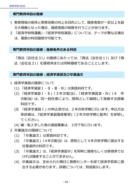 1教育環境の保持と教育効果の向上を目的として、履修者数が一定以上を超え大規模となった場合、履修者数の制限を行うことがあります。2「経済学特殊講義」・「経済学特別演習」については、テーマが異なる場合は、複数の科目履修が可能です。門教育科目の履修:履修条件のある科目専「商法(会社法3)」の履修にあたっては、「商法(会社法1)」及び「商法(会社法2)」を履修済または同時履修であることとします。門教育科目の履修:経済学演習及び卒業論文専1経済学演習の履修について(1)「経済学演習Ⅰ・Ⅱ・Ⅲ・Ⅳ」は実践科目です。(2)「経済学演習Ⅰ・Ⅱ」(3年次配当)、「経済学演習Ⅲ・Ⅳ」(4年次配当)は、同一担任者により、原則として継続して実施する授業科目です。(3)「経済学演習Ⅰ」の申込受付は、2年次秋学期に行います。申込方法等詳細は、『経済学演習履修要項』(2年次秋学期に配布)を参照してください。(4)編・転入学した者の演習募集は、3月下旬に行います。2卒業論文の履修について(1)(2)(3)(4)「卒業論文」は実践科目です。「卒業論文」(4年次配当)は、原則として4年次秋学期に提出する任意選択の科目です。「卒業論文」は、「経済学演習Ⅳ」を同時に履修もしくは修得済でなければ履修することができません。卒業論文は、定められた期日に教務センターを経て経済学部長に提出する必要があります。詳細については、別途指示します。-65-経済学部2025専門教育科目の履修